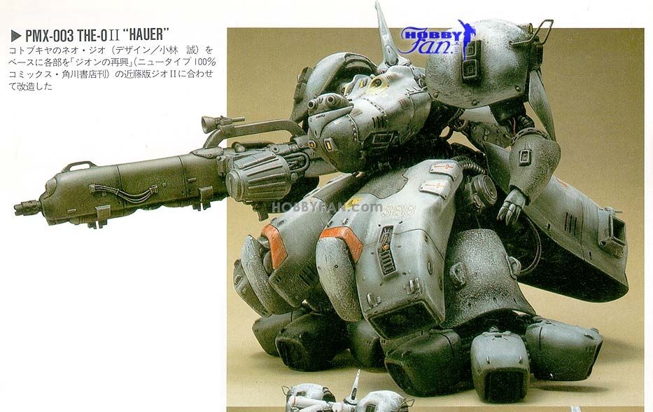 Prototype weapon provides two improvements at the cost of one disadvantage. For instance it might provide two boosts to a weapon’s range, but in return lower the number of shots the weapon makes or the penetrating factor. You could use this on the unique bullpup of the Act Zaku which is a 4-barrel machinegun to increase it’s number of shots (but in return lower its range) or you can use it to represent the gigantic machine gun of the ground-based ‘The O-II’ “Hauer” seen in Kondo’s Revival of Zeon alternate history manga.