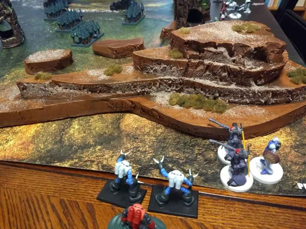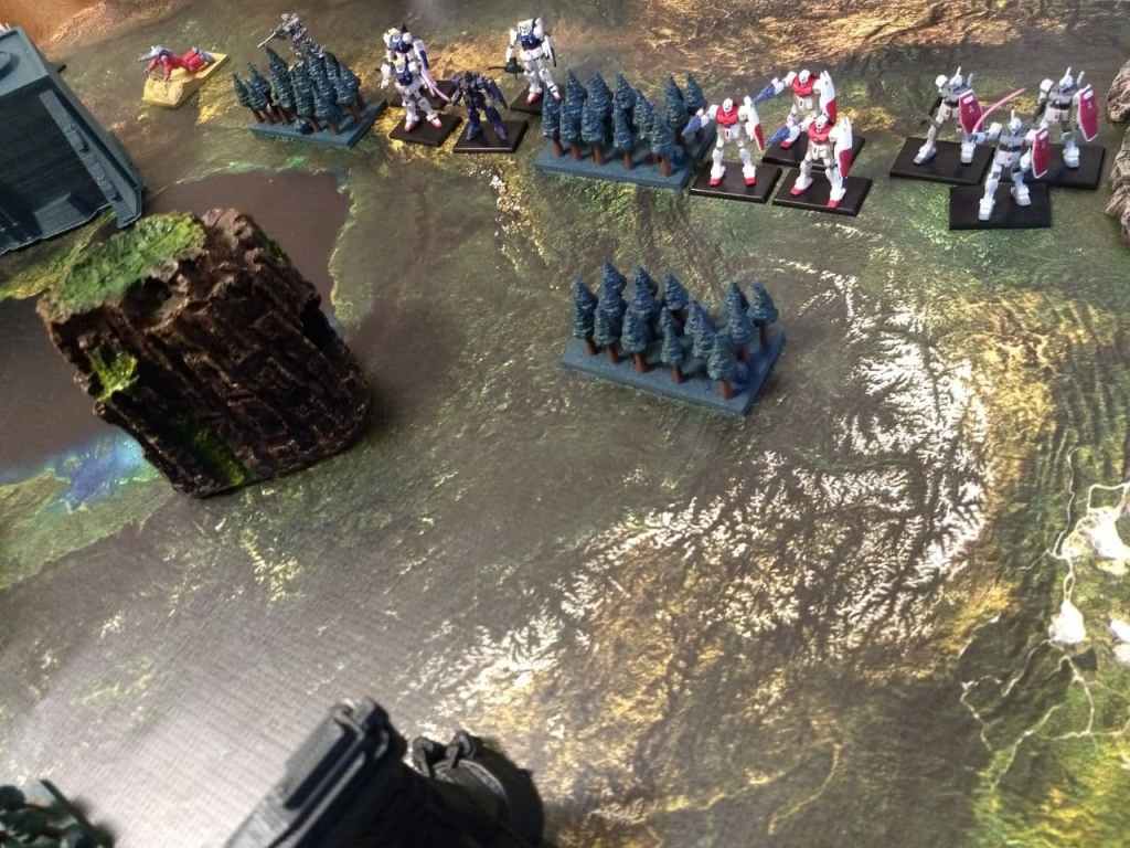 The Zeon player keeps the Z’Goks in reserve, deploys the high value units behind cover and keeps the cheaper Zaku on the wings of the main stretch. They keep the two Dom’s and Gyan on the far left edge behind the mesa.