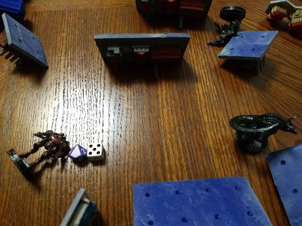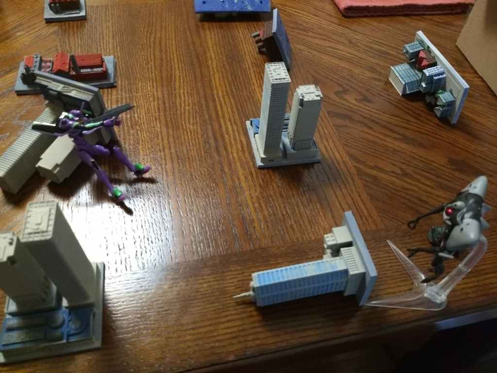This test was Eva Unit 01 against Shamshel the 4th angel who looks a lot like a giant shrimp. Since I don’t have that model yet, Sachiel was proxy’d in its place. I didn’t take notes for this one but it was quite fun throwing Unit 01 around and destroying buildings each time. This was the first time an Angel nearly killed Eva Unit 01, as a result I realized the damage was a bit too high on the throw maneuver since it was far more effective than the energy whips. 6/10 buildings destroyed as I recall.