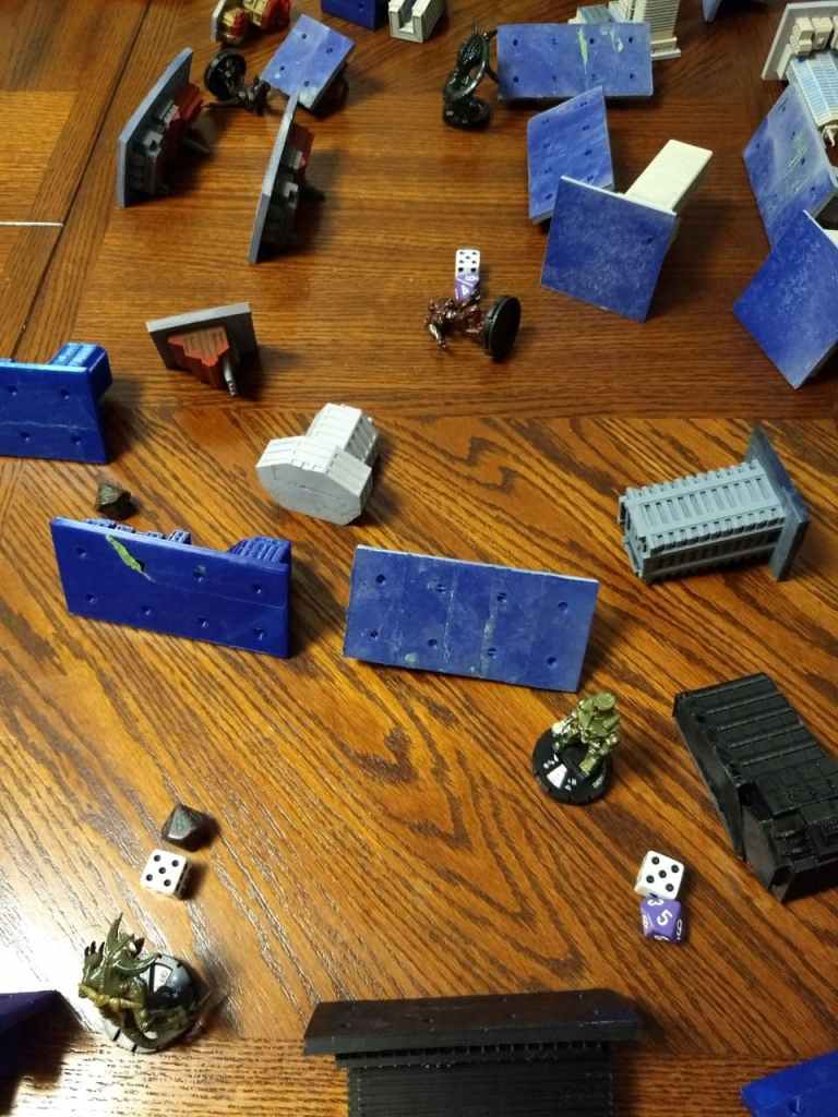 Buildings used in these tests are from Greeblecity, scaled up to 200% and printed with PLA on a monoprice mini printer. The ones with hasty paint jobs were done with a simple primer plus some extra paints from a Reaper bones kickstarter. If you would like to use them on the download page there is a link to the Greeblecity line of free 3d sculpts.
