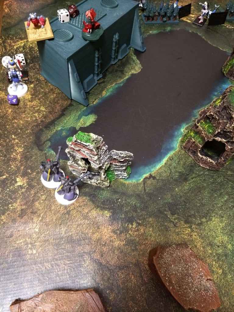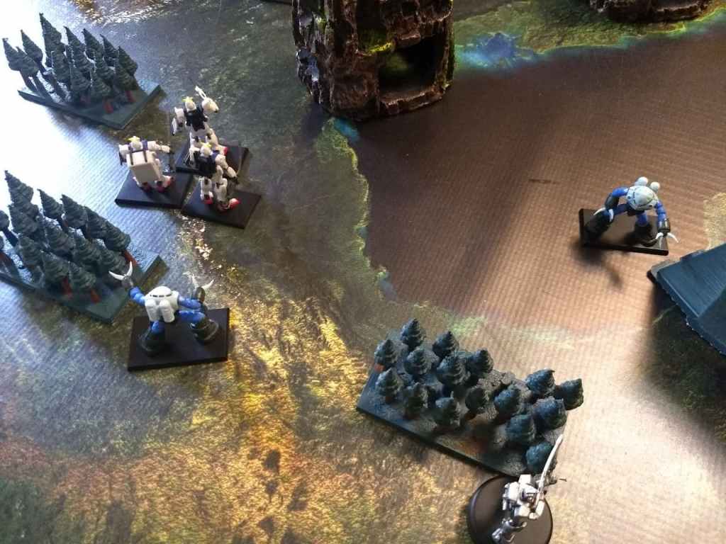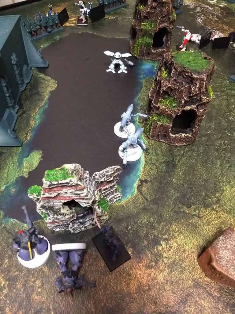 After the Federation player has activated all their units, Zeon uses their last 3 Momentum to Ambush in the Hy-Goggs staying out of Sensors or Line of Sight of the enemy models and deploying in the lake near all the excitement. The Zeon player stages two close to the Blue Destiny and one near the Gundam Ground Types.