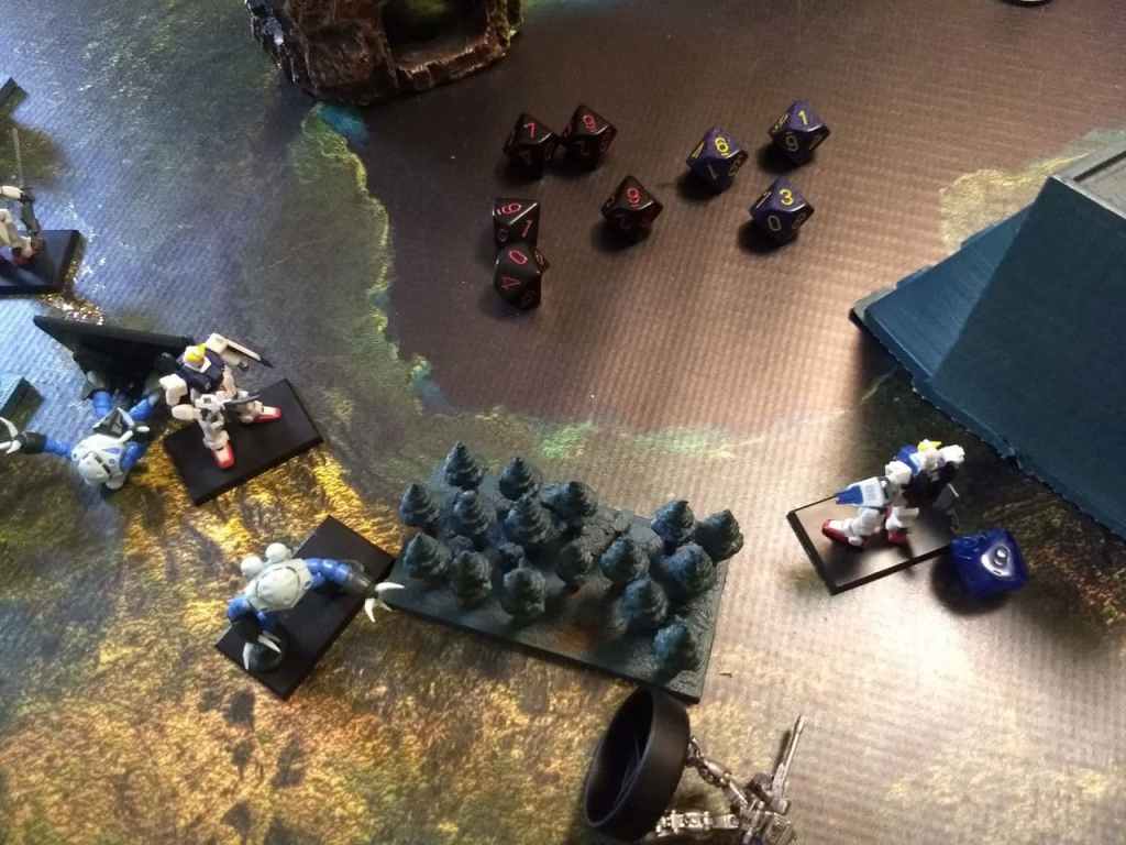 EFF: Vengeance! A Gundam Ground Type with a beam rifle activates, fires another 3 shots into a Gouf Flight type then engages the Z’Gok from behind with their beam saber. Shooting Accuracy 8 vs Evade+3 (+4 Flight Mode), the Gouf needs a 4+ and Evades all 3. Now for a Melee with Blindside (+2d10 Melee)