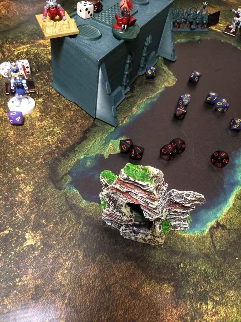 Z’Gok: 3d10 [1, 6, 3] 1 Block total. 4 Hits get through dealing 4×500 or 2000 DMG. The Zeon player could burn 3 Momentum for +3 Blocks and only take 500 DMG, but with a PEN of 5 it’s unlikely they’d survive the Armor Save and so the Z’Gok goes down. The Federation player gains +1 Momentum for winning melee and +1 for destroying an enemy unit. (Final Momentum 7)