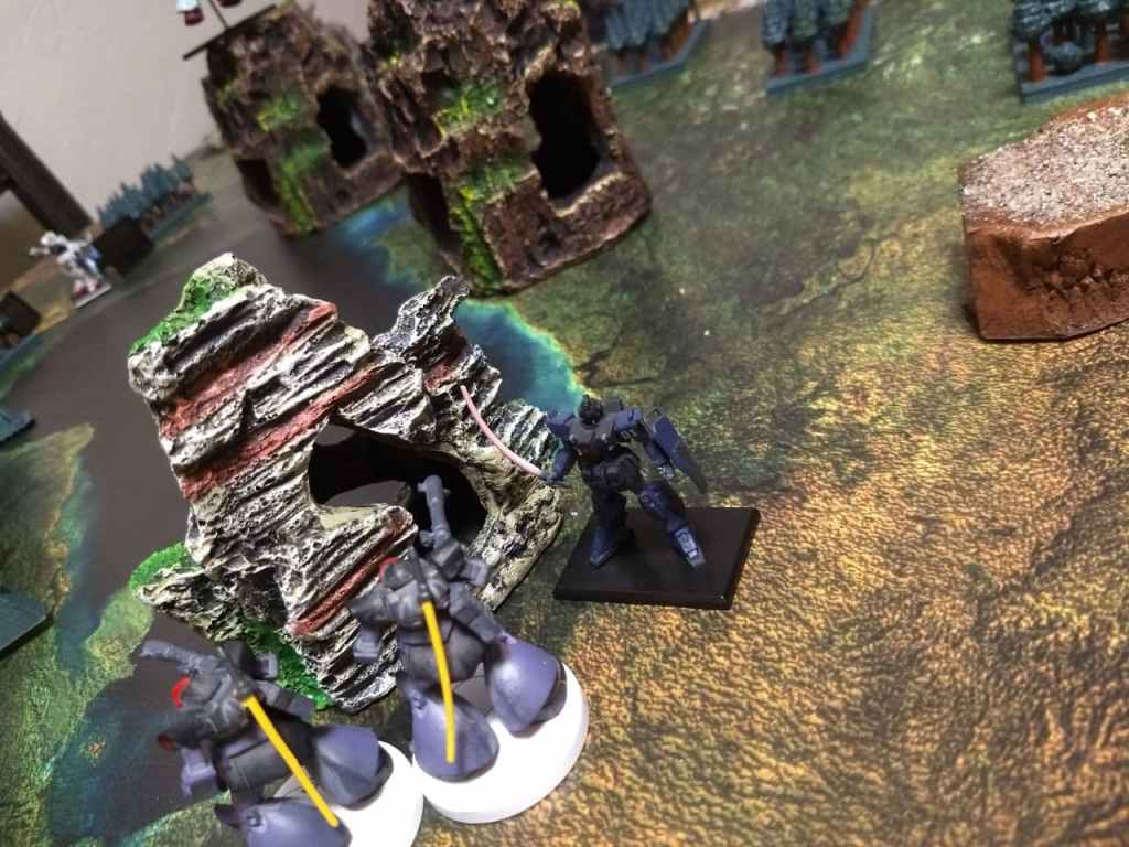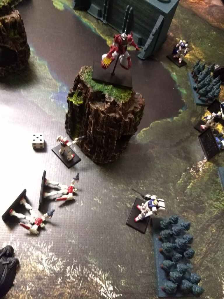 Zeon: The remaining Gouf Flight Test Type activates, continues using Flight Mode and presses forward finishing it’s movement on top a piece of terrain. It already has high ground due to Flight Mode but never hurts to be king of the hill. It fires at the nearest enemy model, a GM Command Space. It is a Blindside attack so the GM cannot use its Shield.