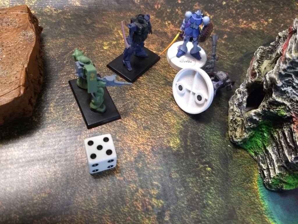 Zeon: Decisions, decisions. It’s unlikely any of his units will be able to take out the Gundam or Blue Destiny in one turn, he could go after the Guntank or low HP Gundam Ground Type, but then he’d risk losing either the Gyan or Z’Gok before they have a chance to activate. Almost choosing the Gyan he reverses course and instead opts to go with the Z’Gok as his first activation. Once more Char issues a challenge to Amuro and the two must fight one another. Char’s Z’Gok starts off by using a Melee Attack. He spends 2 Momentum on Make it Count for +2 Hits and Newtype focus grants an additional Melee+1d10.