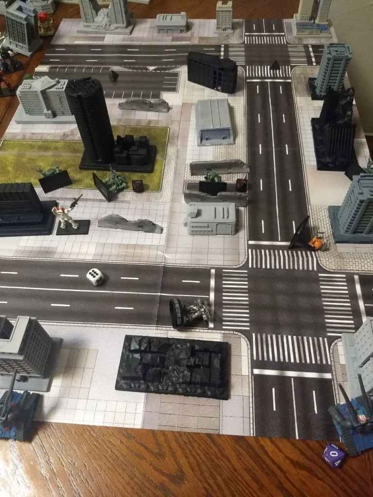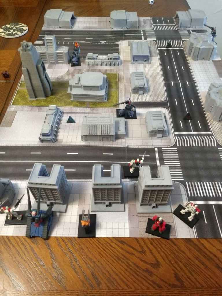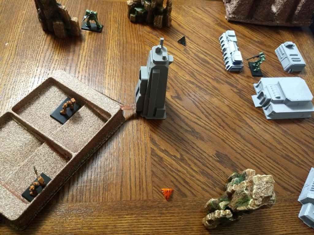 Mission 5 will have the same layout as Mission 1, we used 3d Printed militarized style buildings for Mech Hangers, Facotories and maintenance shops along with some C2 buildings, barracks on one end and hangers on the other. The mat is from Drop Zone Commander.