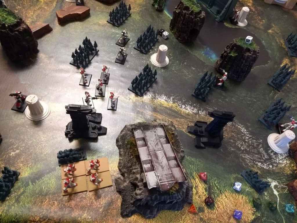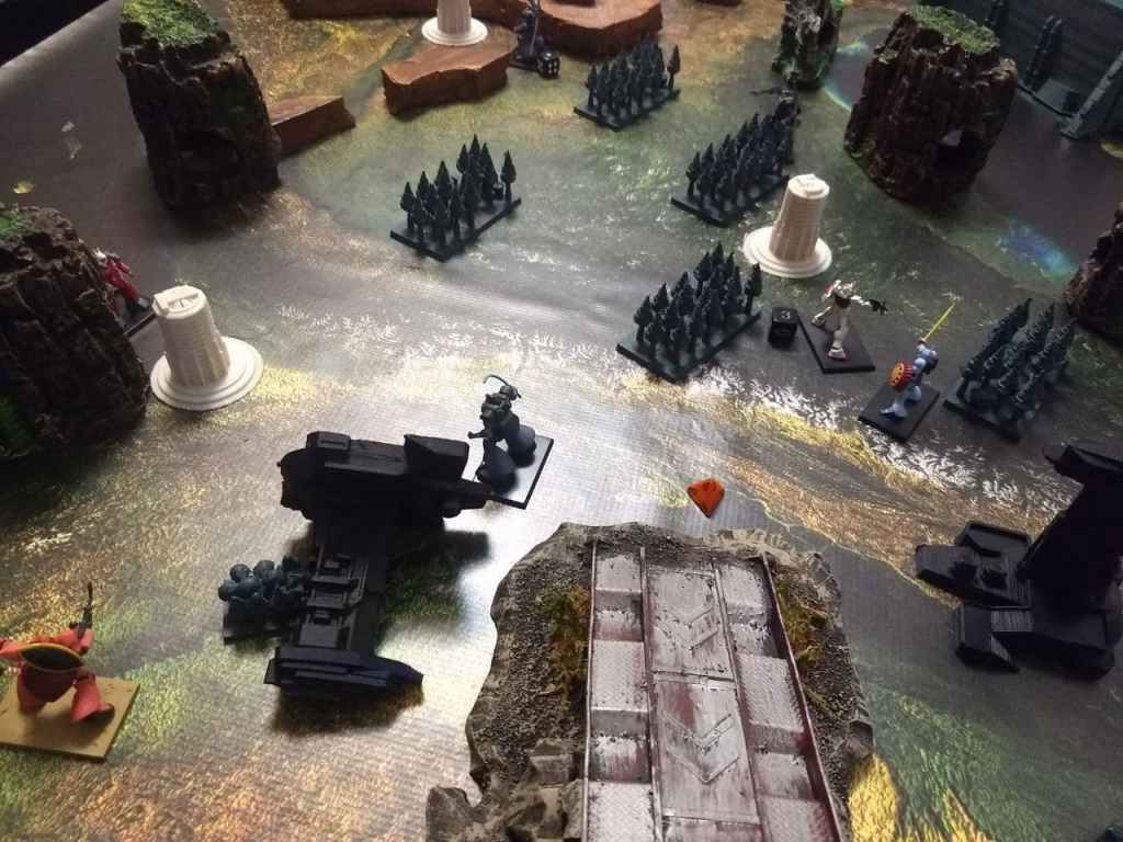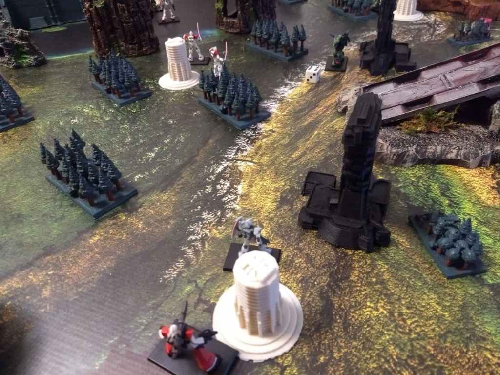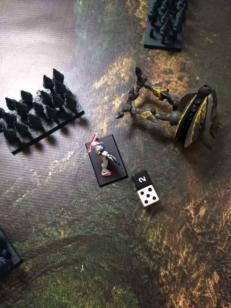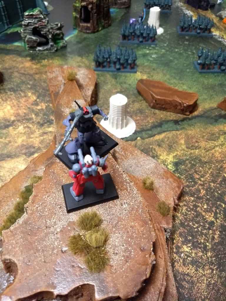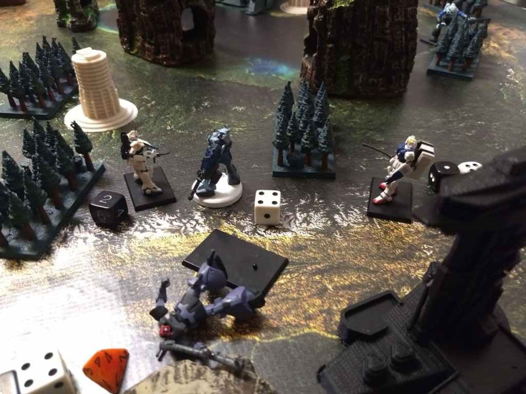 While it’s always fun to smash large armies with Big Zam we went with another canonical battle having the Gundam face off against the Big Zam. This one was rather anticlimactic since Big Zam misjudged how far back they moved and the Gundam made it into melee range in Round 3. With some lucky rolls he used the Giant Slayer Command and wiped him out. The rest of the game involved the Dom’s chasing down the Guncannons.