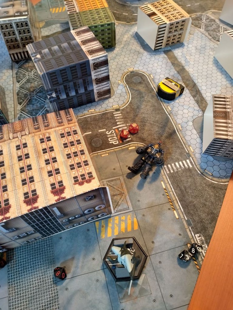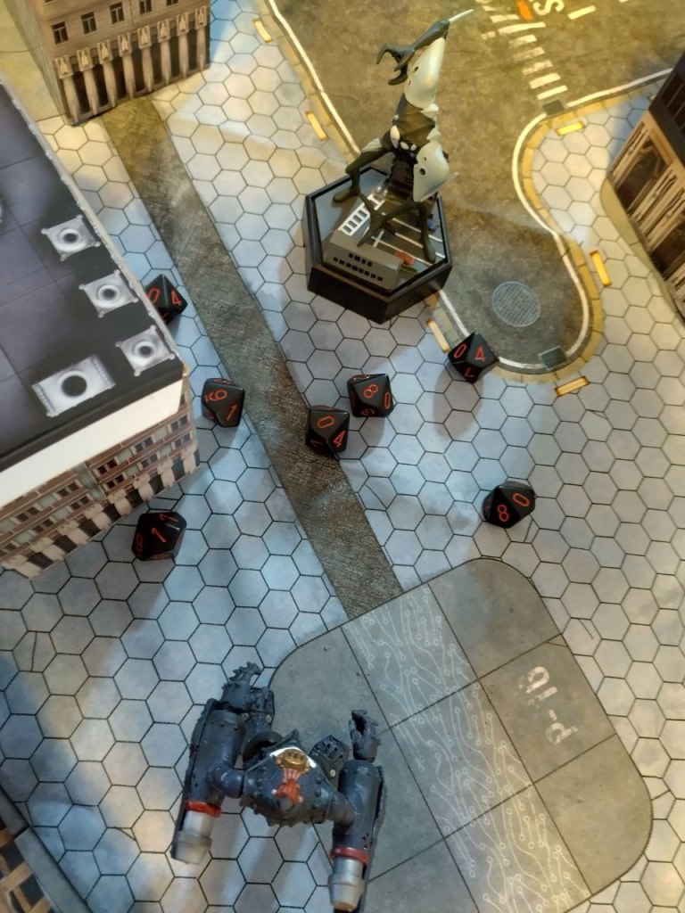 Big O goes first, it’s piston rears back but his fist slams into the AT Field with a bad melee roll; Sachiel counterattacks for another 2500 DMG (Big O +1VP, M+1). On Sachiel’s turn it strikes Big O in Melee (Big O +1 VP, M+1) then disengages; another Cross Explosion lights up the city destroying 2 more buildings (Sachiel +1 VP, M+2) while Roger burns through Momentum to narrowly avoids the explosion, the players visualized it as Roger used Big Os anchors to pull himself out of harms way like in the fight with Schwarzwald.