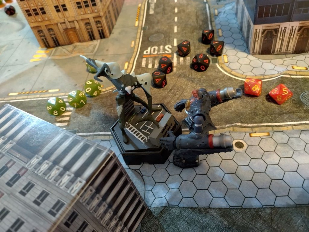 Sachiel goes first this round, Big O relies on its Shield Arms and Sachiel fails to destroy him, it disengages from Melee and uses the Momentum it saved up for one last Cross explosion destroying 50+% of the buildings (Sachiel +6 VP). Big O makes a lucky Evade roll but even with its large lumbering Shield arms it needed one more block to survive. Big O goes down.