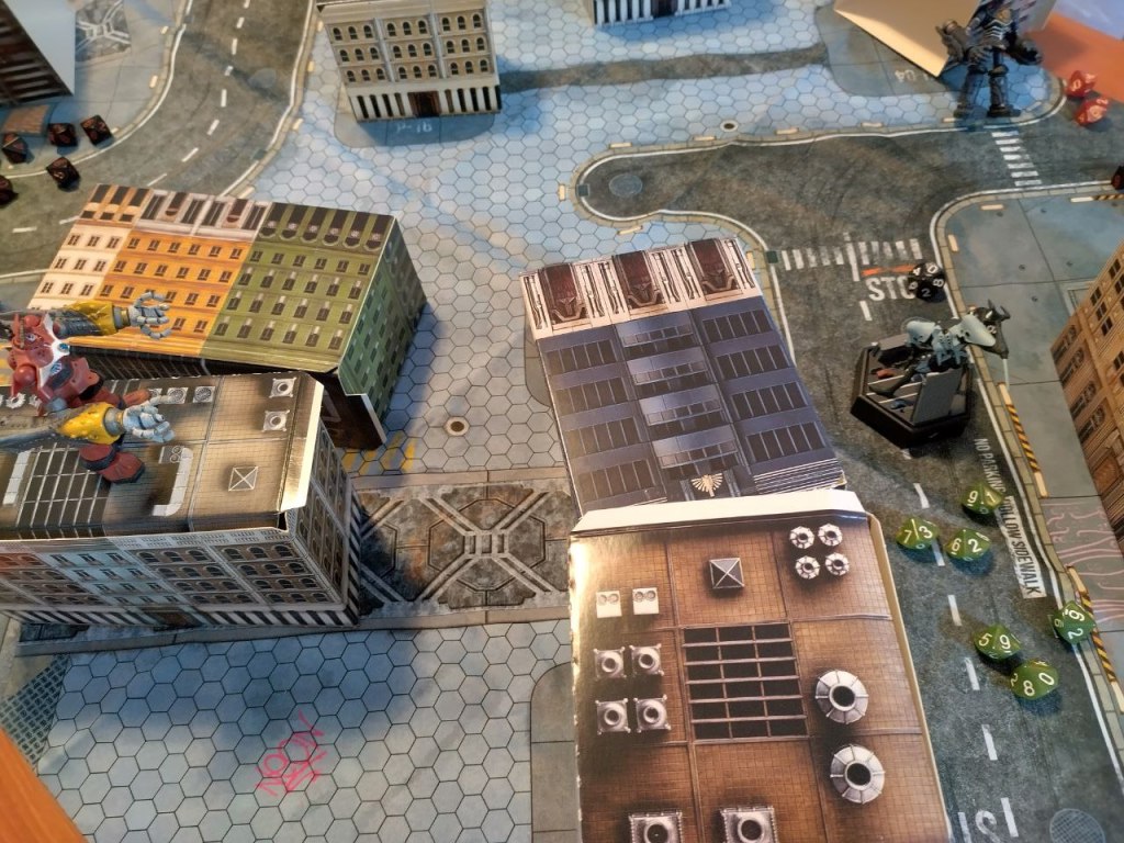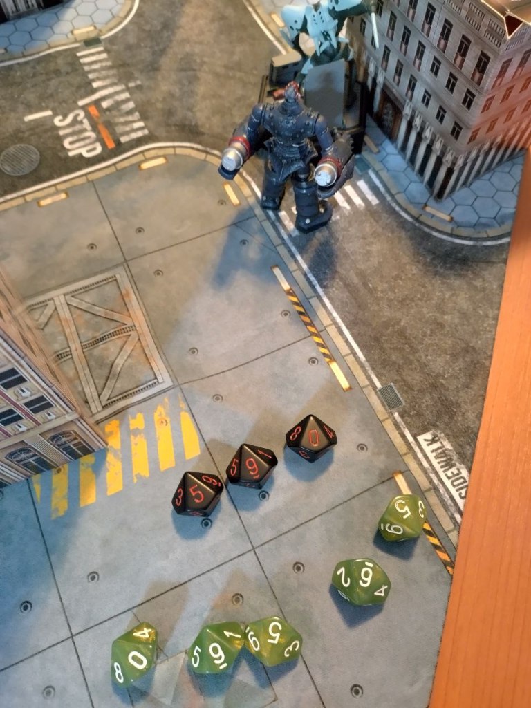 Big O wins initiative and Blindsides Sachiel delivering several Critical Hits with Giant Slayer (M-2) and luckily breaking through the AT Field for 1000 DMG (Big O +1VP). Sachiel whirls around and uses it’s Close Combat [CC] weapon to smash Big O into the adjacent building destroying it (Sachiel +1 VP) and dealing 3000 DMG to Big O (+1 VP).