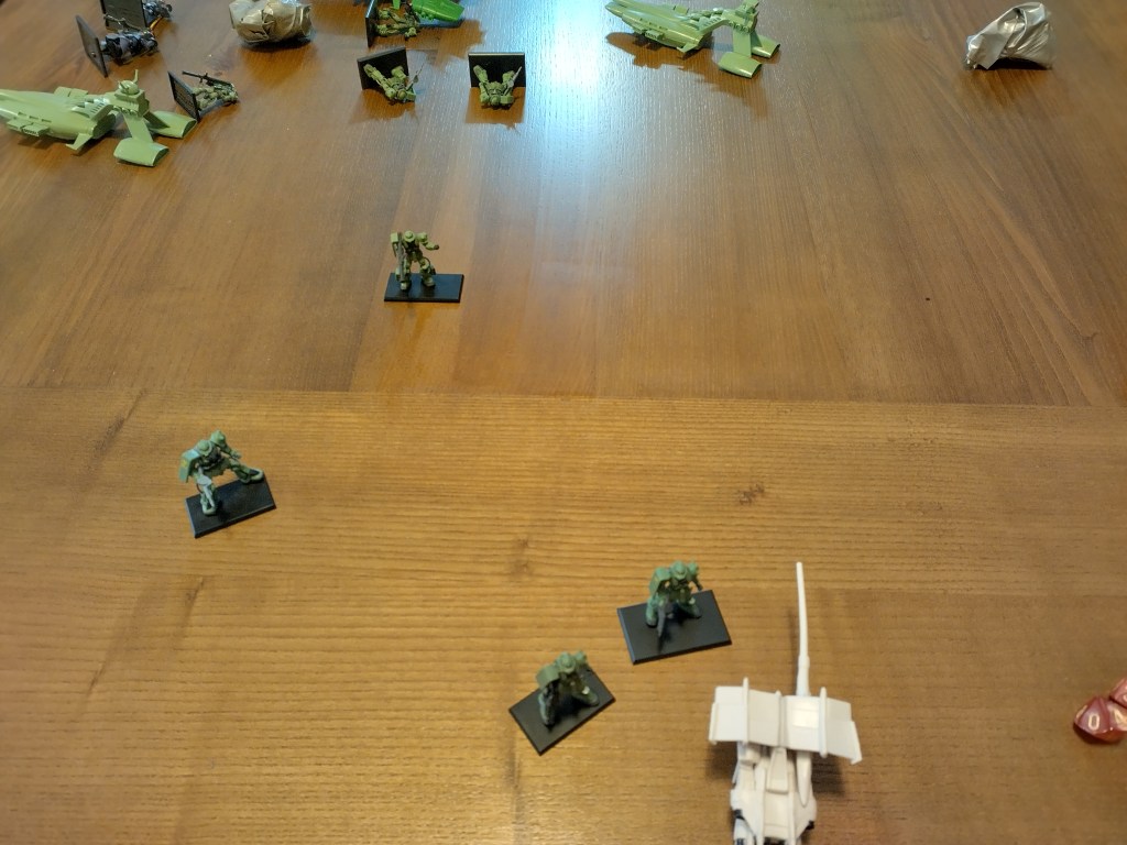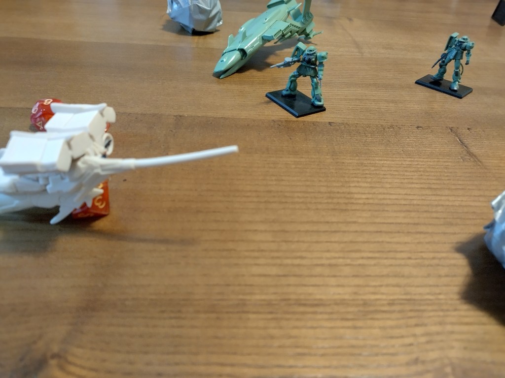 The Zakus and Dom pursue it, GP03 loses all but 1 Momentum and then its struck by two bazooka shots and machine gun fire. On the Musai’s phase, unluckily GP03 roll two very poor Evasions and the twin-mega particle cannons cause the I-Field to overheat and shutdown (Momentum = 0).
