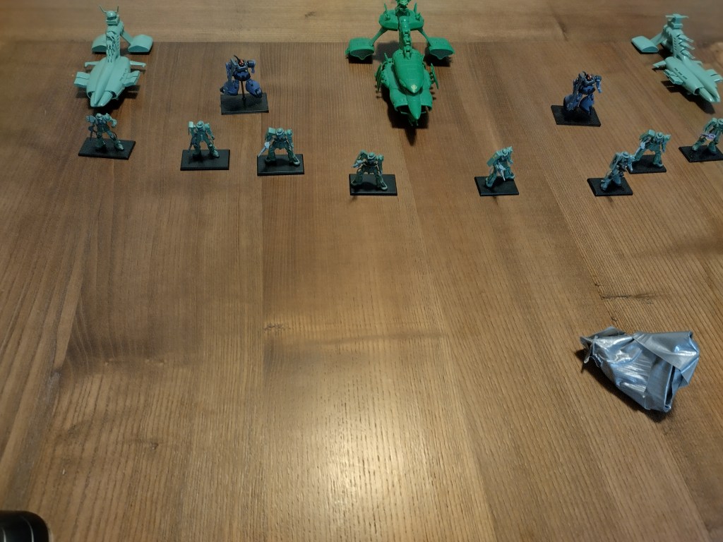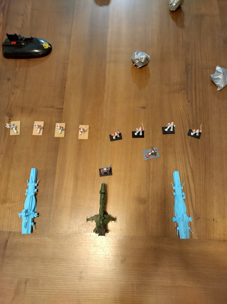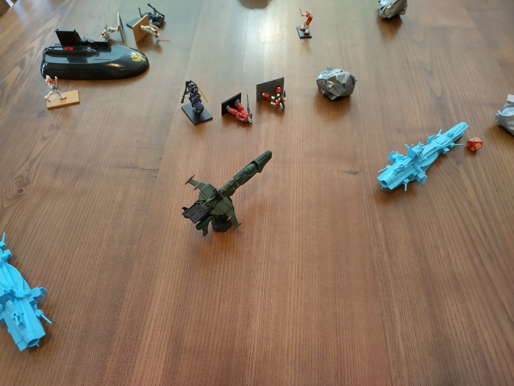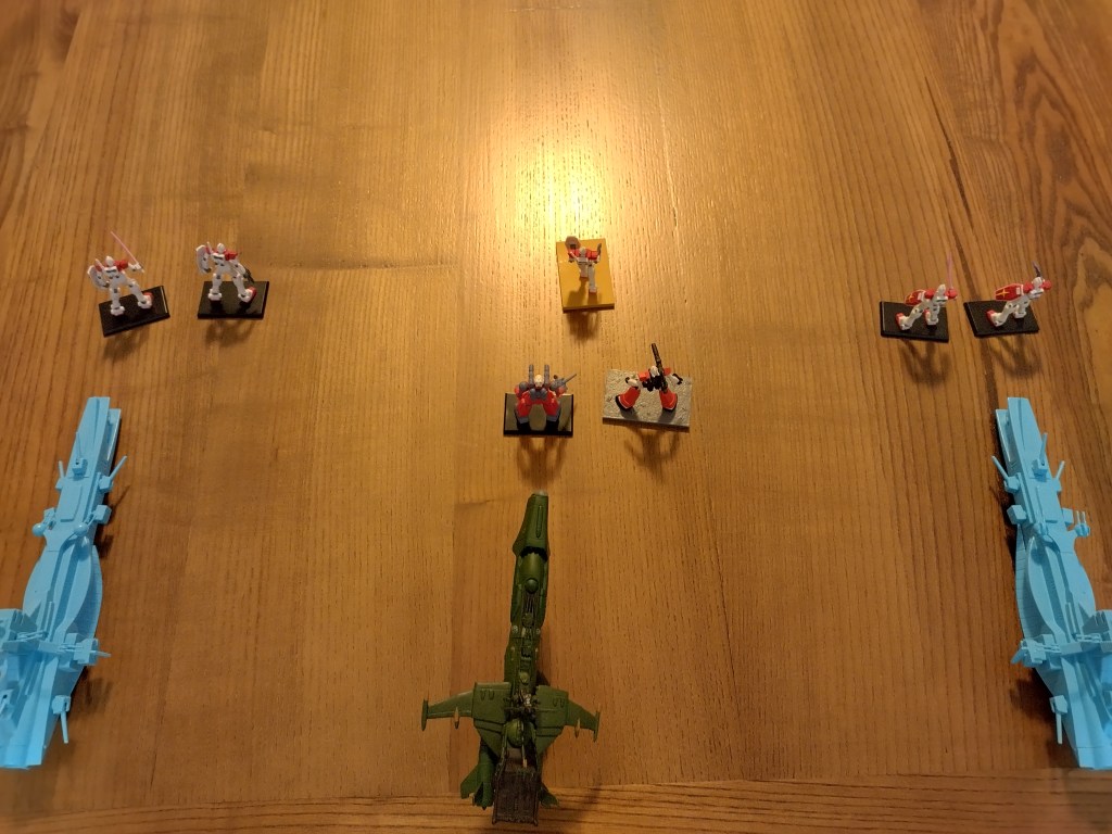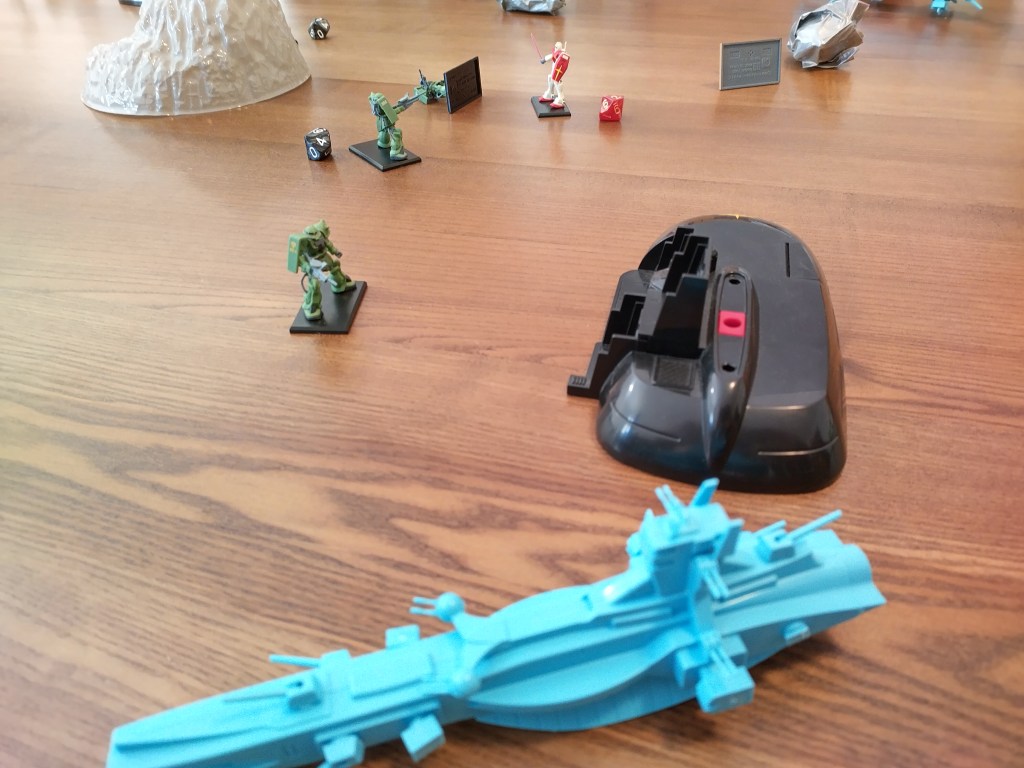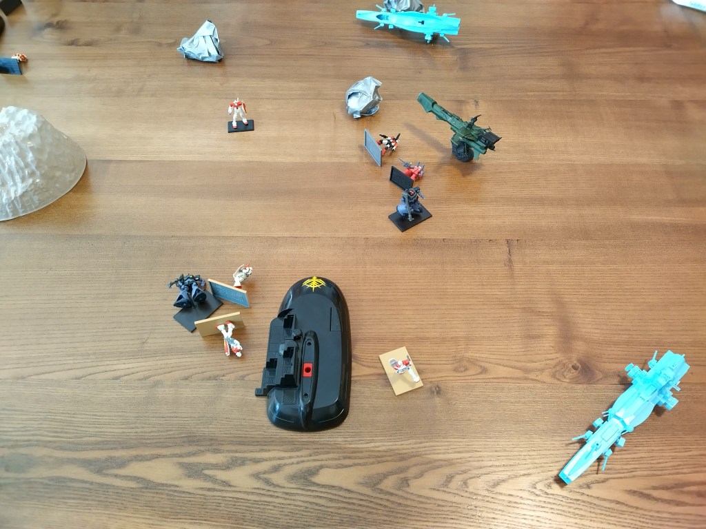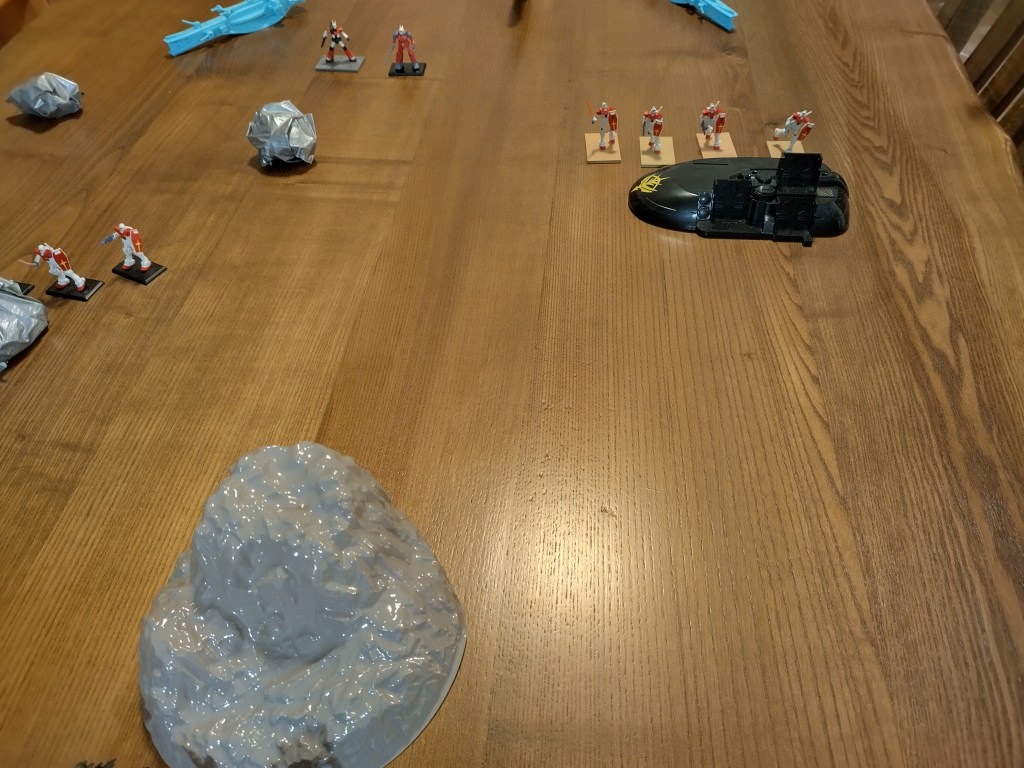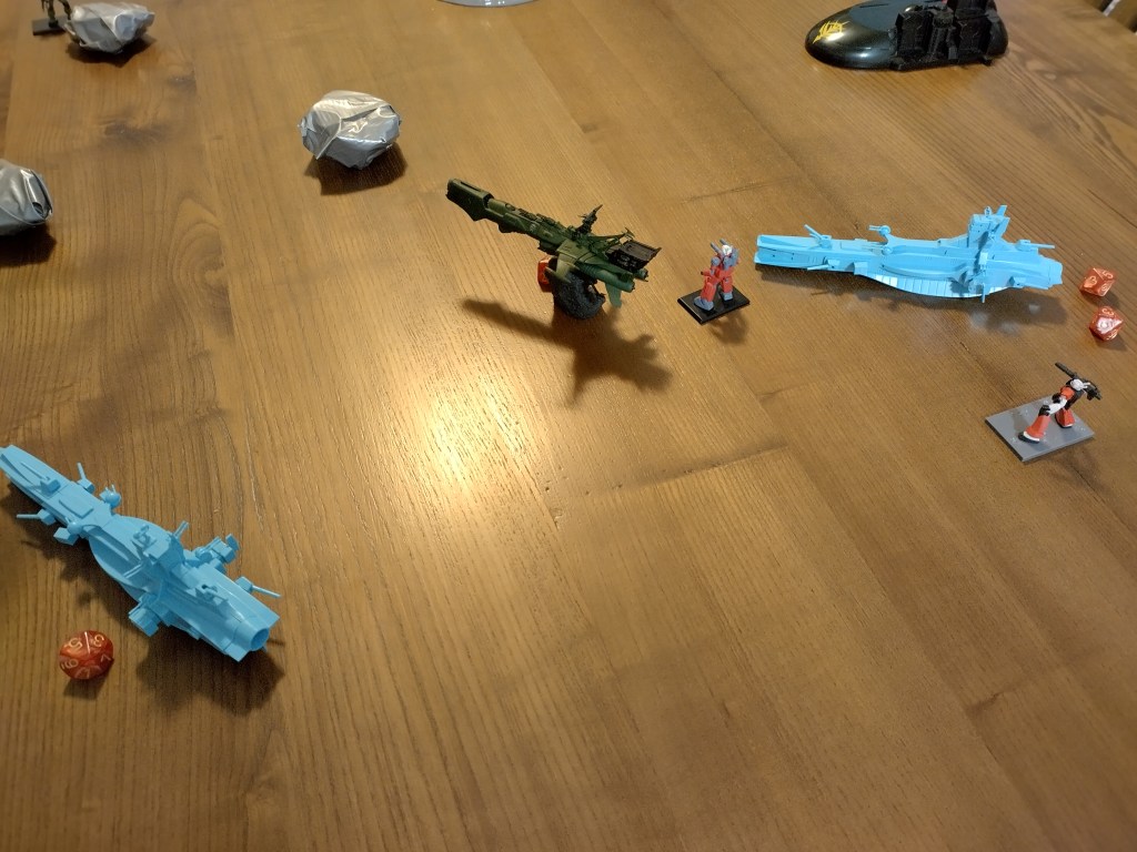 Here are some photos taken during some recent games testing out the Magellan class battleship from Mobile Suit Gundam. Since I don’t have my Magellans kits built yet, we used Captain Harlock’s The Arcadia as a placeholder model. As you can see from the final photo the Magellan class Battleship did pretty well.