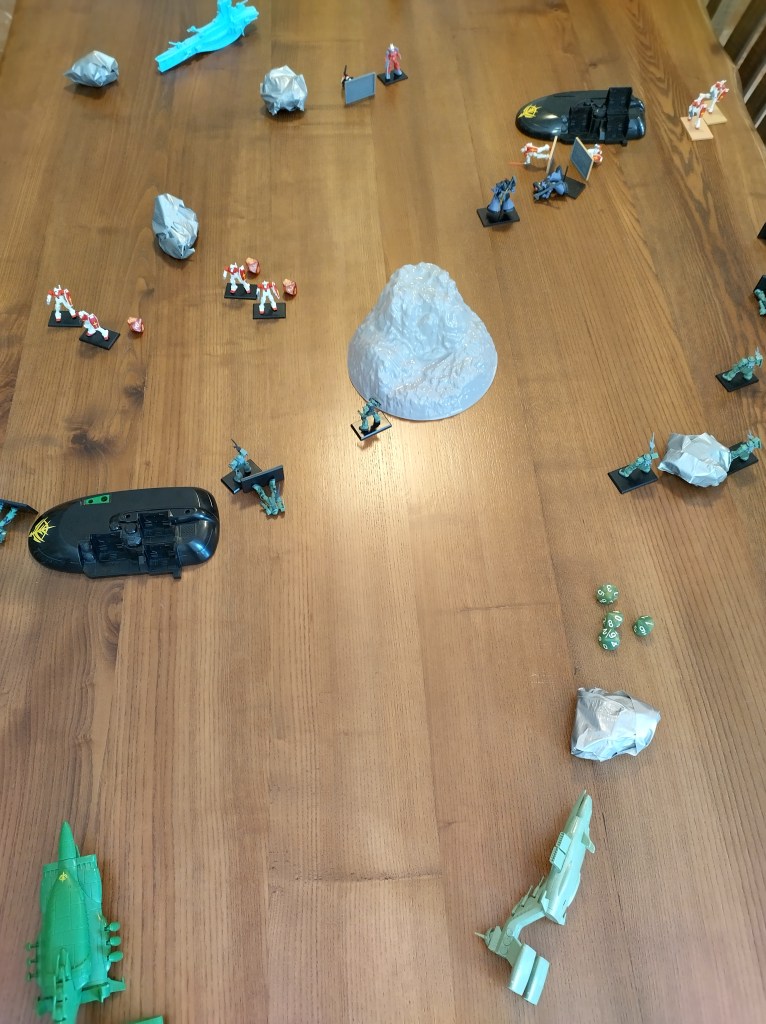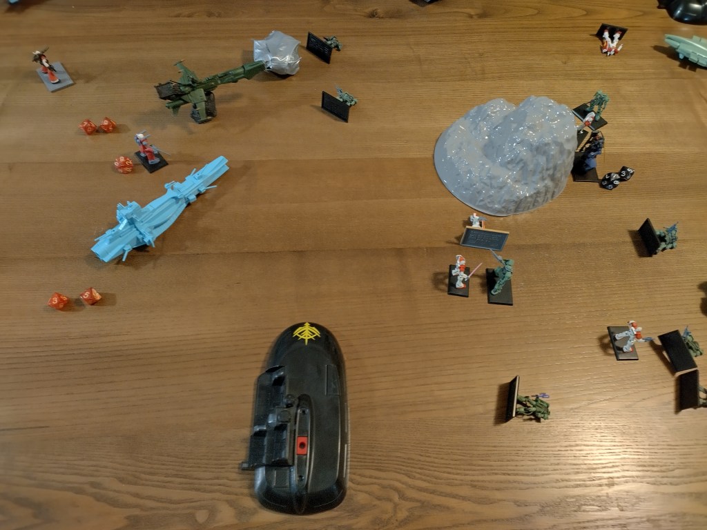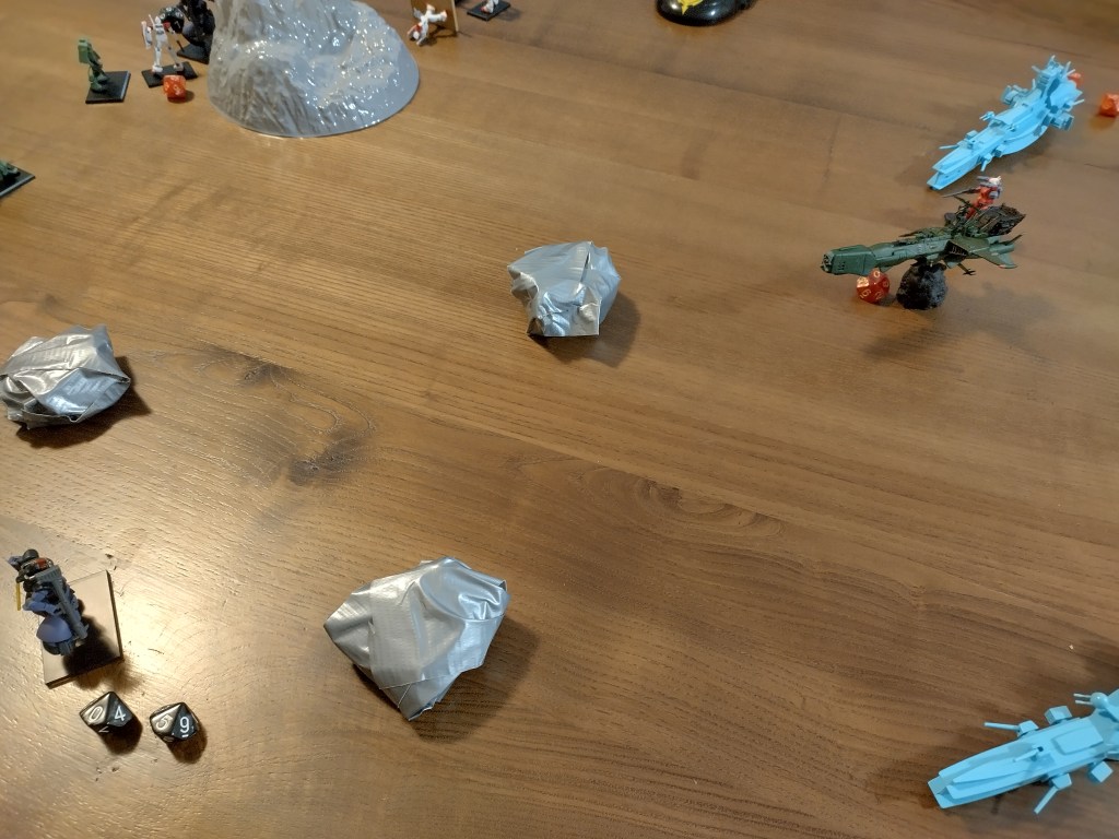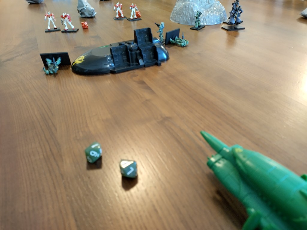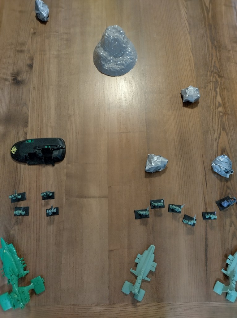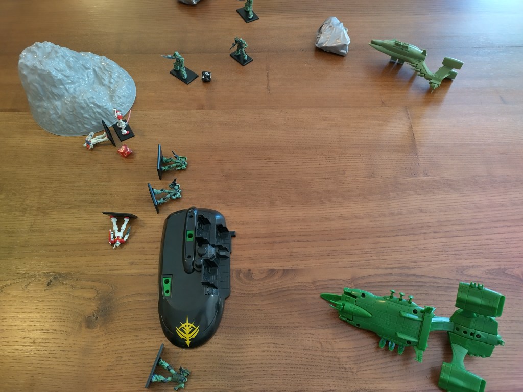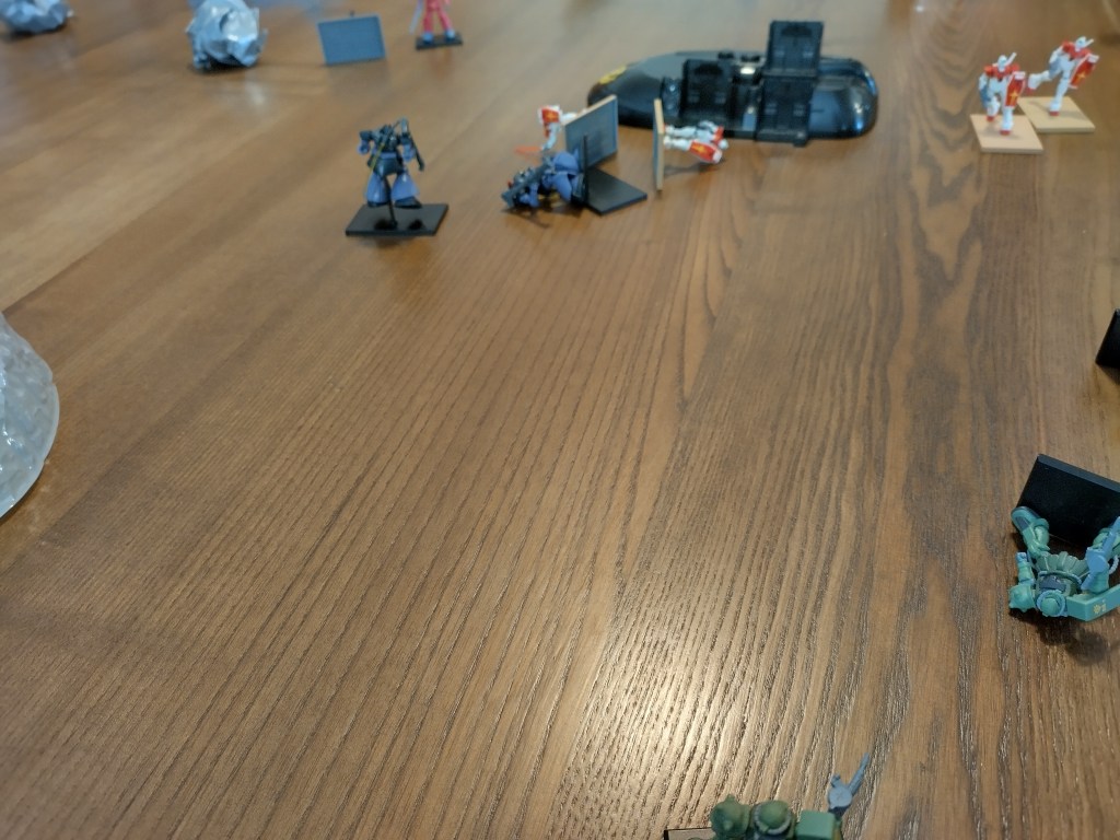 Here are some photos taken during some recent games testing out the Magellan class battleship from Mobile Suit Gundam. Since I don’t have my Magellans kits built yet, we used Captain Harlock’s The Arcadia as a placeholder model. As you can see from the final photo the Magellan class Battleship did pretty well.