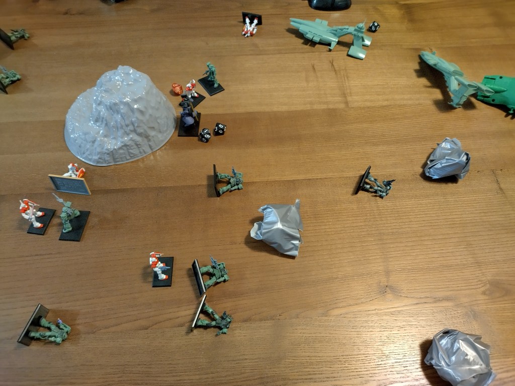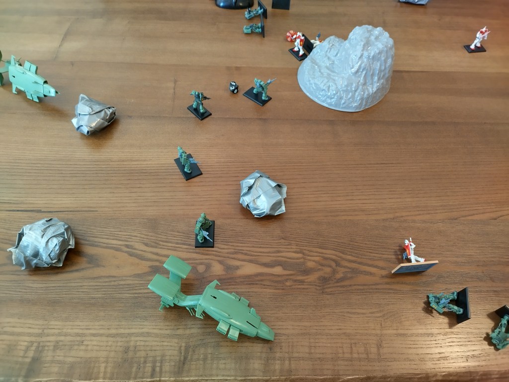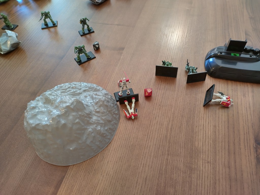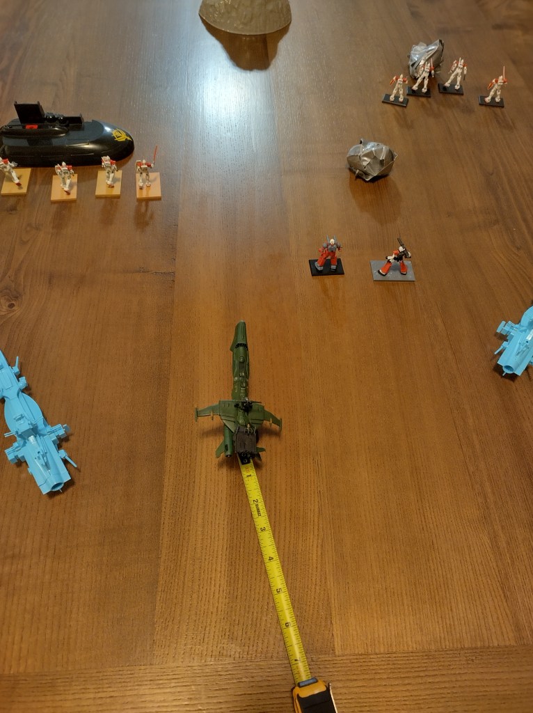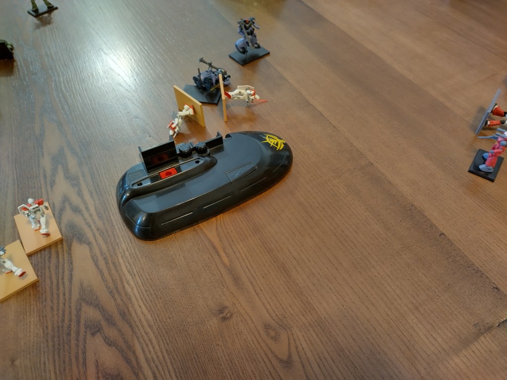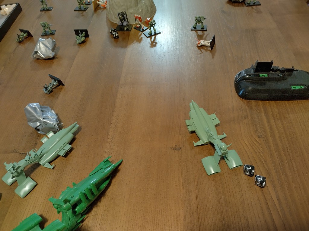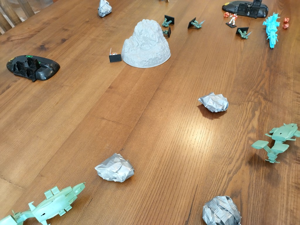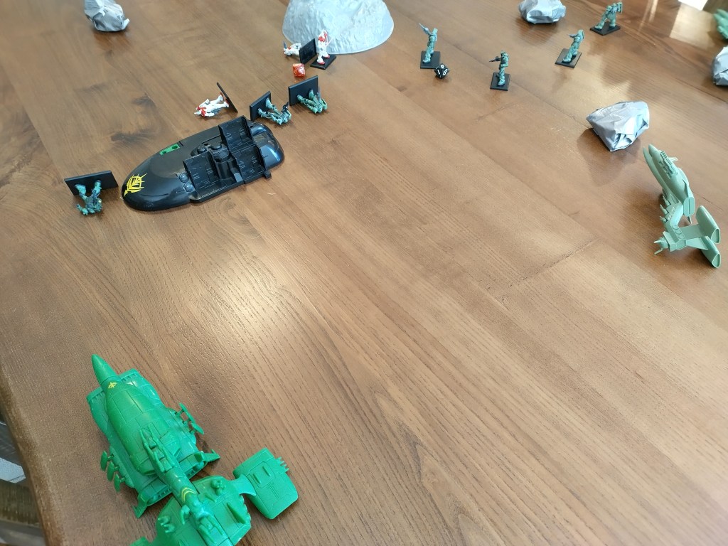 Here are some photos taken during some recent games testing out the Magellan class battleship from Mobile Suit Gundam. Since I don’t have my Magellans kits built yet, we used Captain Harlock’s The Arcadia as a placeholder model. As you can see from the final photo the Magellan class Battleship did pretty well.