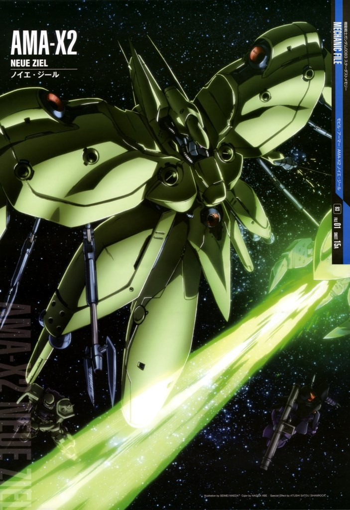 The Neue Ziel is an impressive mobile armor taking a Big Zam like approach to firepower and combining it with a very mobile unit as well as a good amount of missiles for additional non-beam firepower. It sports megaparticle guns on its front and back-tail, missiles on its front and back-tail and a large Megabeam launcher on its torso. As a result we gave it a trait that allows it fire most of its weapons in a 360 degree arc, which we also backported to the Big Zam.