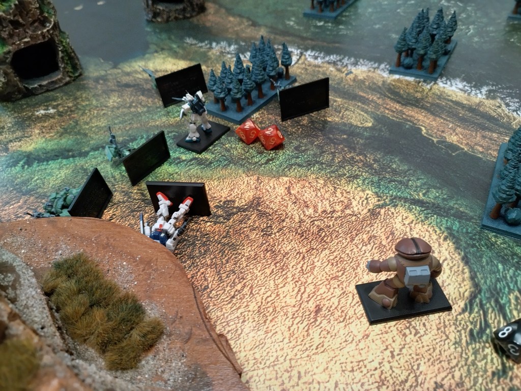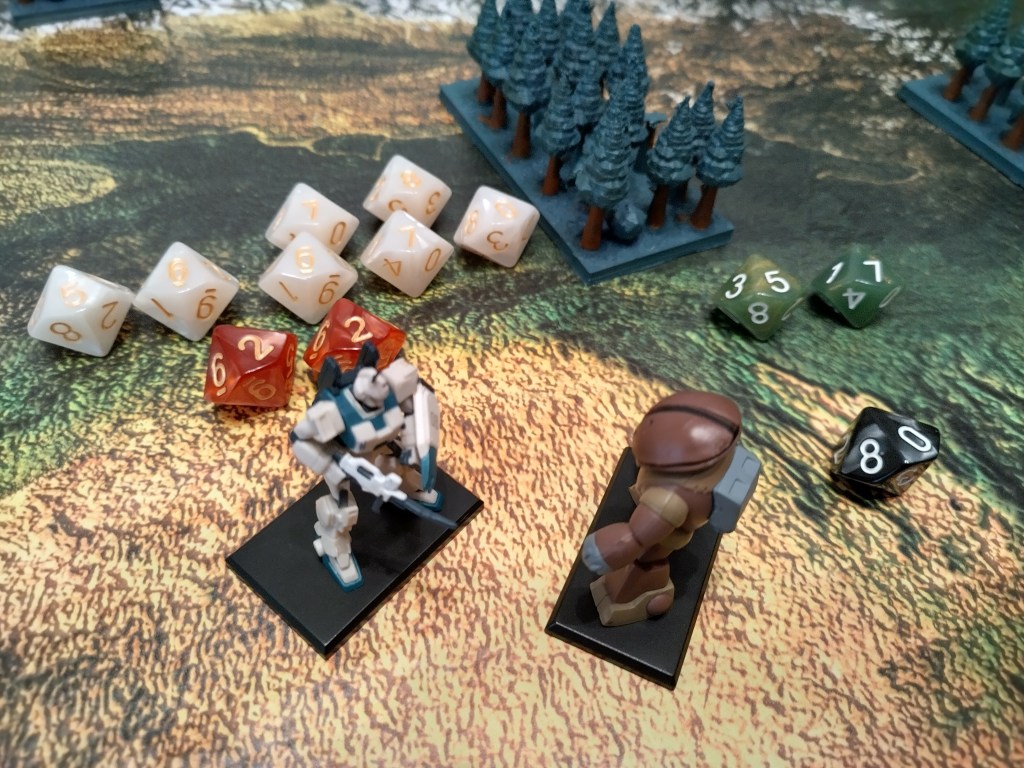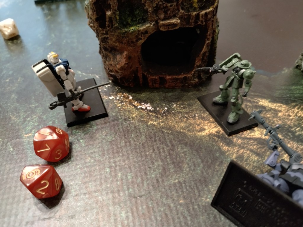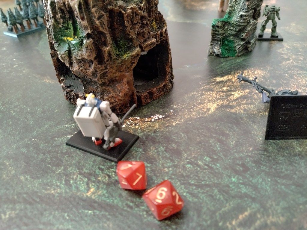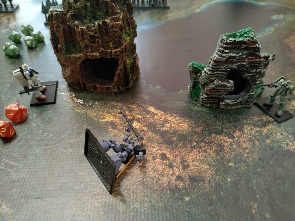 MechaStellar is designed around 5 round games so with that we conclude the game. If the players continued past round 5, the lone Zaku II has a decent chance of taking out the Ez8 Gundam.