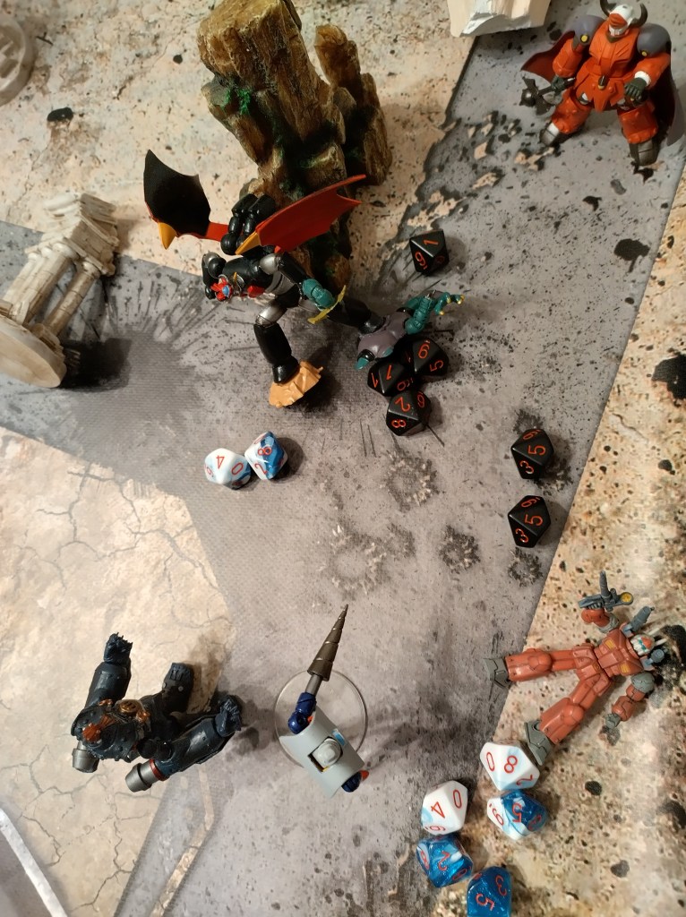 We were also testing out a few rules changes that made the Super Robots too easy to kill, as you can see here with GoLion going down very early to GGG Hell and Heaven attack and Eva Unit 02 getting it’s core punched out by Big O.
