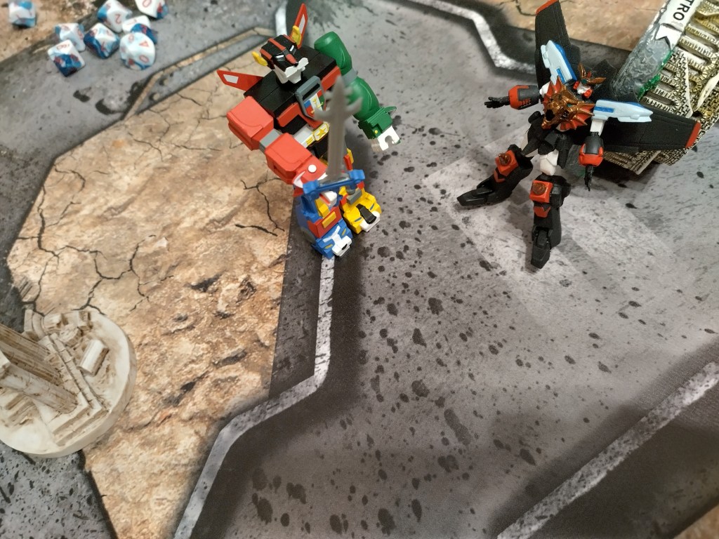 A quick match with just GoLion and GaoGaiGar trying to test out the Knockback rules and some adjusted movement rules. We ended up liking Knockback quite a bit and kept it in for every other playtest game until we got to the final version.