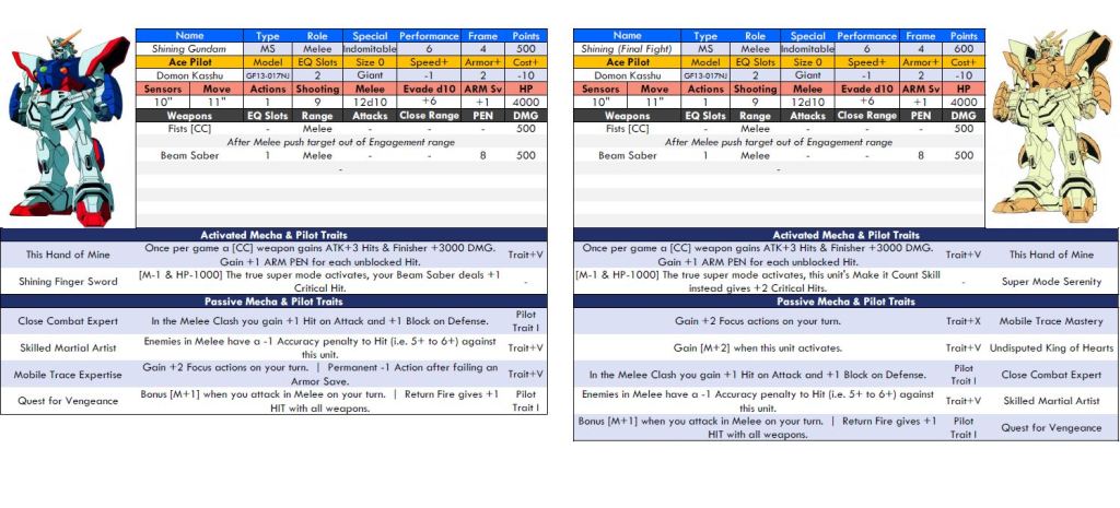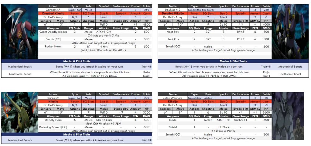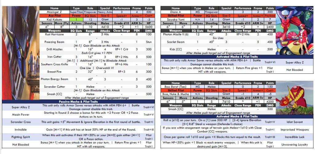 In addition to updating the core rules for MechaStellar and the Super Robot / Kaiju gameplay in VER 9 we have also been working on an update to the Mecha Unit Profiles based on player feedback. Here are two examples from a draft VER 9 profile. Our goal is to update the profiles by either late May or late June depending on how much feedback we get.