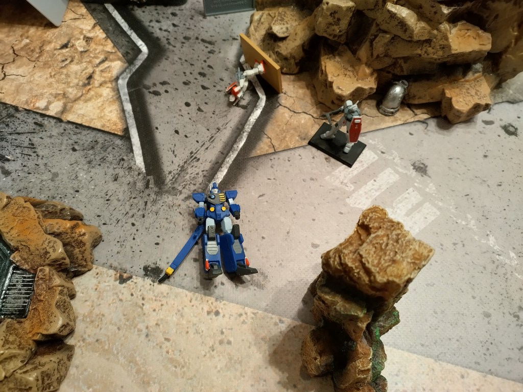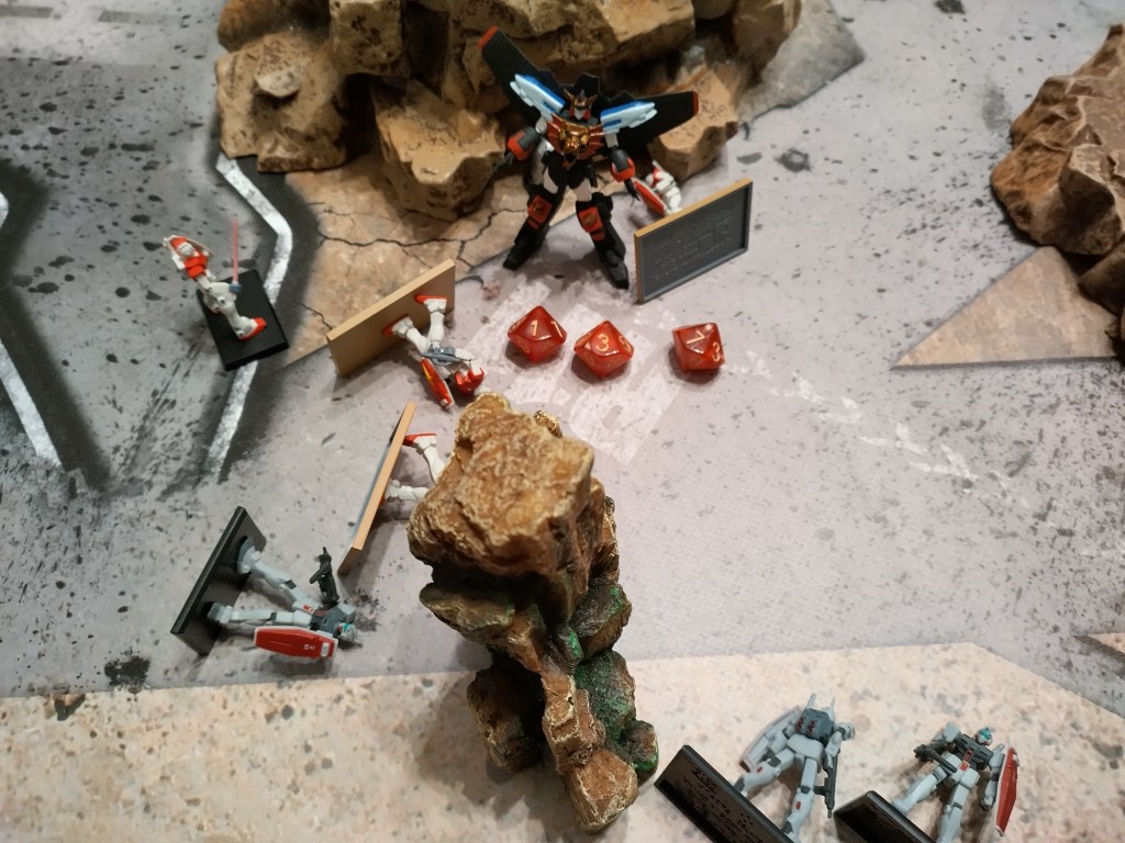 This was a challenging battle at first. In the early games we had over-costed both HyoRyu and EnRyu who were too fragile for their points cost and easily overwhelmed by the GMs. GaoGaiGar as the very expensive unit could be used as a screen to absorb fire for 2 rounds by the two of them rarely survived past Round 3.