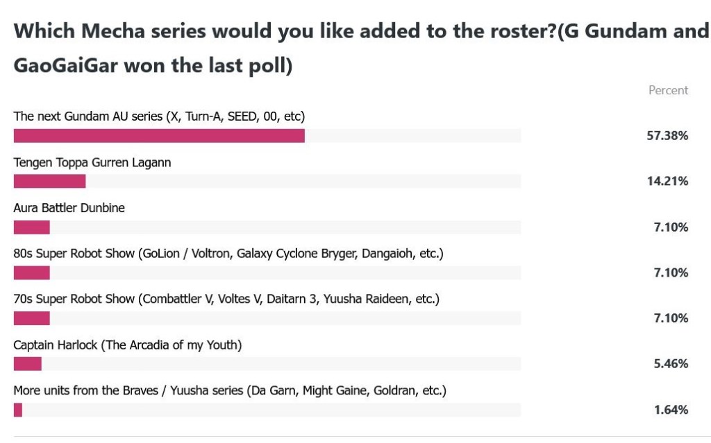 On the game downloads page we keep a poll to track user feedback on which mecha series they’d like to see added to the roster next. Normally we select the top two options of the poll which usually ends up being a Gundam show and a Super Robot show.