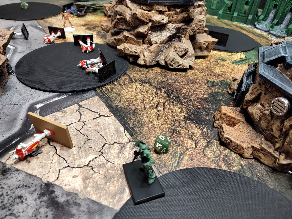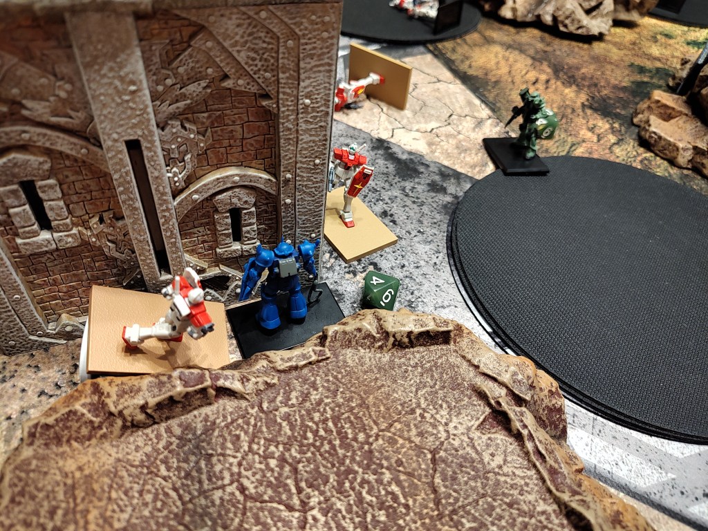 He may have survived that round, but cannon troops got into position at the end of Round 4. It’s the curtain call for my Zaku commander. As I usually play team Guncannon I did not care for them burning turned against me.