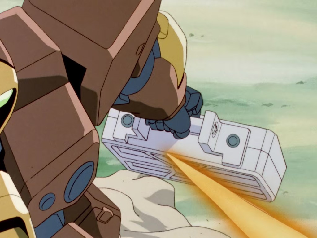 One thing you’ll notice while watching the show is how common solid shell munitions are, especially considering most of them are replaced with beam equivalents in the Zeta era of the UC. You’ll also notice that mobile suits are often hit by beams without the catastrophic effects normally seen, my personal favorite is the Witz episode where the Airmaster is trying to retrieve MS sized attache case from the Daughtress Fire Wallabys and beam rifles shoot the case out of their hands repeatedly.