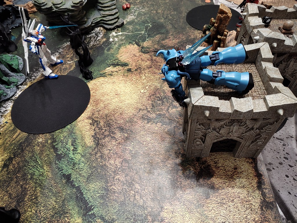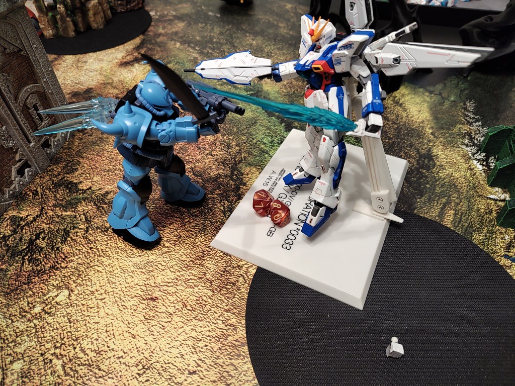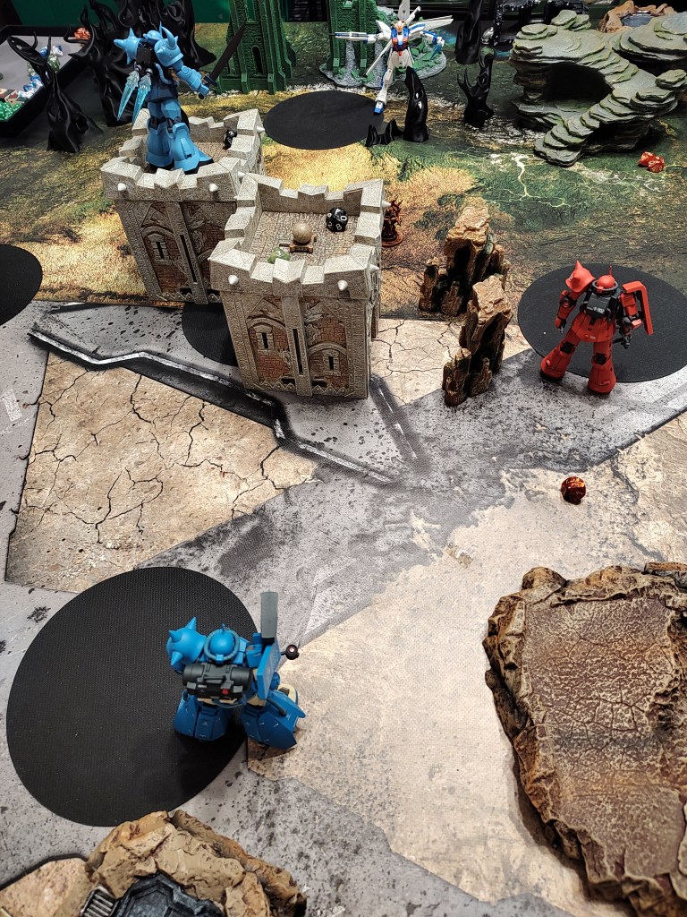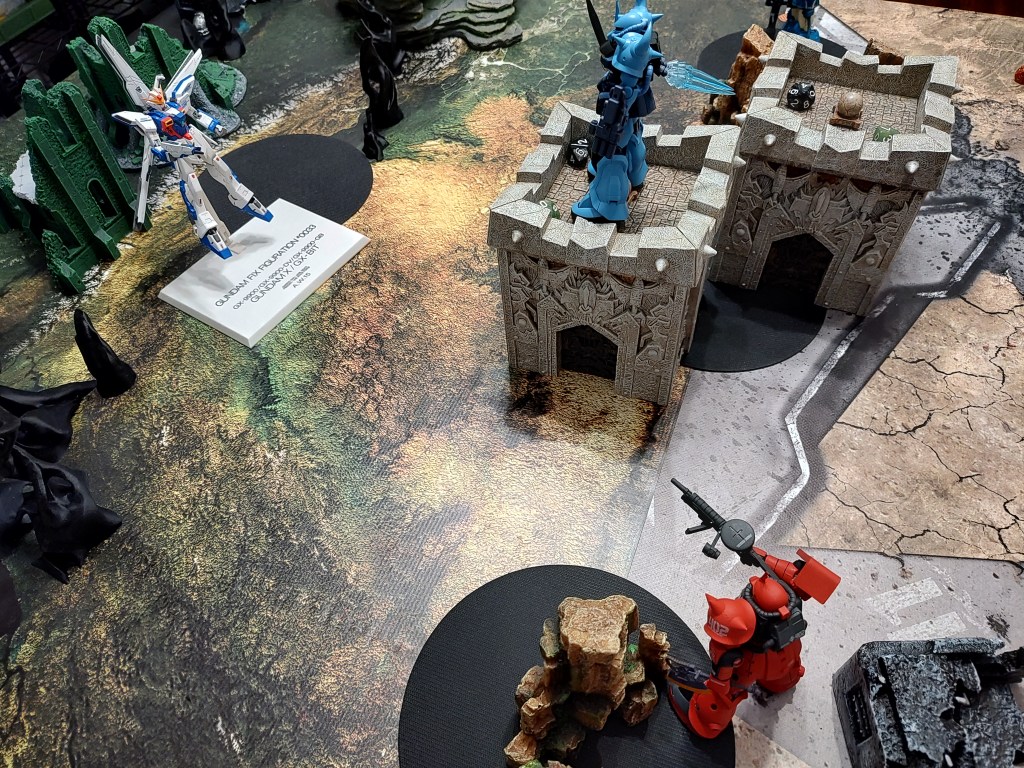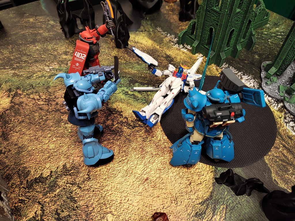 These are 500pt games with the GX-9900 is facing off against 2x Jenice MS (represented by the Gouf Custom and Crimson Zaku II) and 2x Septems (represented by the High mobility Zakus). We took off the Anti-Beam Coating to make the enemy units cheaper.