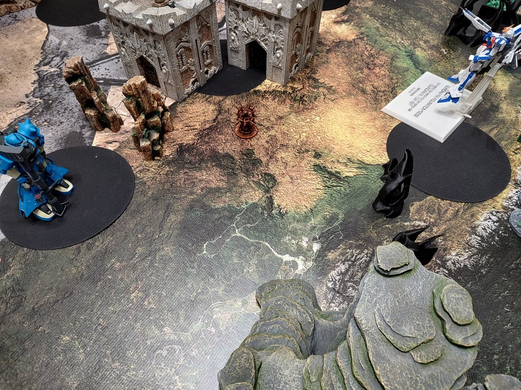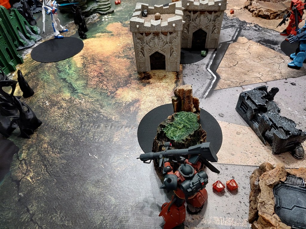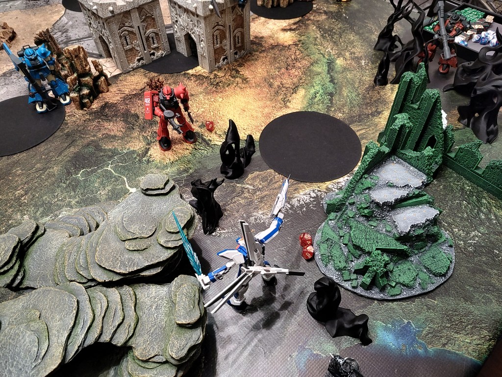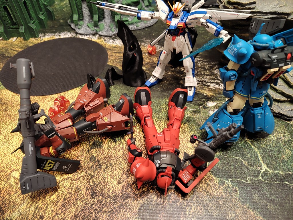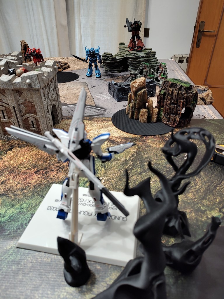 These are 500pt games with the GX-9900 is facing off against 2x Jenice MS (represented by the Gouf Custom and Crimson Zaku II) and 2x Septems (represented by the High mobility Zakus). We took off the Anti-Beam Coating to make the enemy units cheaper.