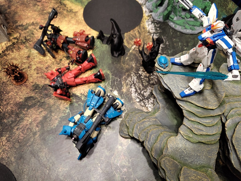 “Oh no”, says Garrod’s Player. Unused to playing against zeon-esque units with such good speed they did not anticipate them all getting into melee IN ROUND 2.