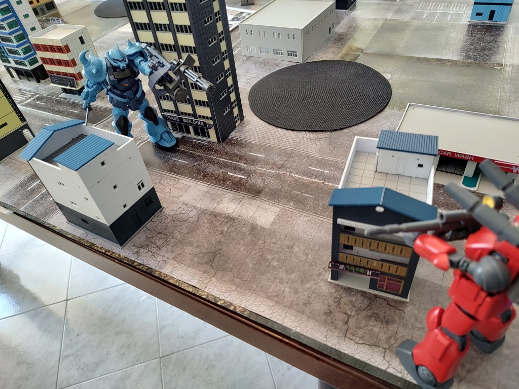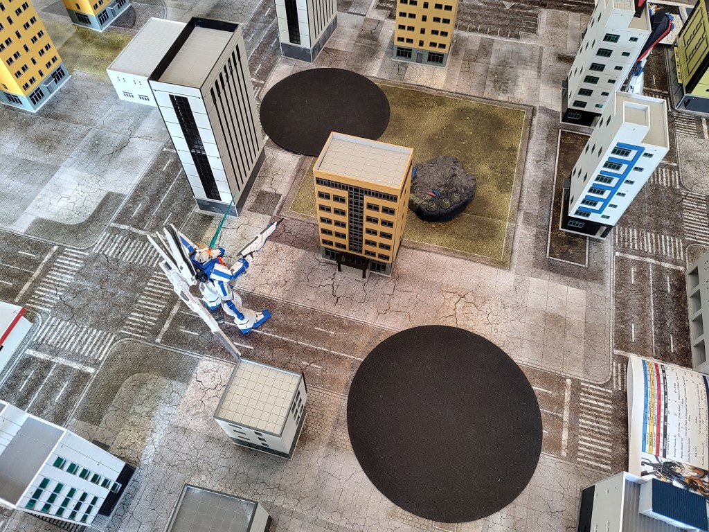 Then he strikes the building with his beam saber. Since he’s targeting it directly it has to roll FIVE armor saves vs DMG 400. They roll [2,4,5,8,9] that 2 causes the abandoned Jaburo facility to go down. Now he has clear LOS and Target Lock on Zeta Gundam.