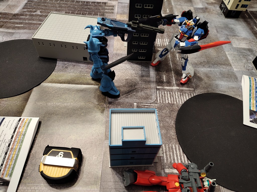 Here we have a gameplay example for MechaStellar VER9.5 using 1/144 scale Gundam figure. On one side we have Kamille’s Zeta Gundam and Kai’s Guncannon, on the other we have the unlikely teamup of Garrod’s Gundam X (GX-9900) and Norris Packard Gouf Custom. Read on below the break for Round 5.
