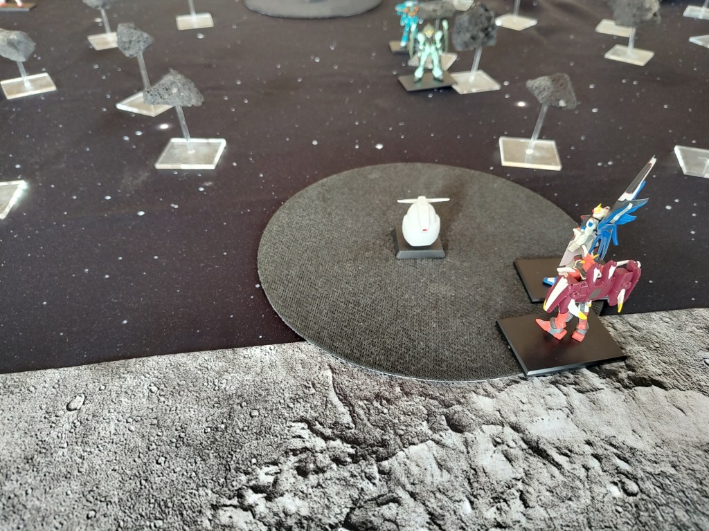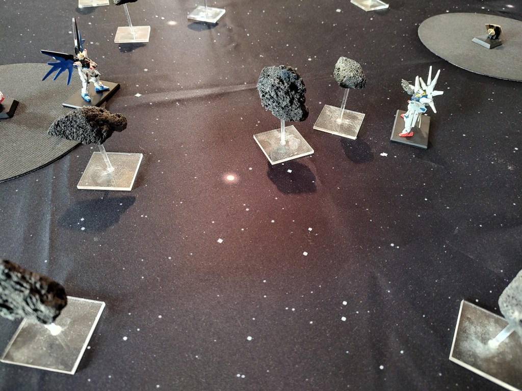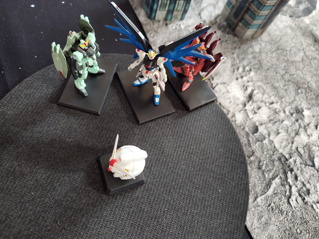 A battle shot of Forbidden trying to swoop in and scythe through Freedom, but Kira + SEED mode held the line. This was back in the time where SEED (and the related Berserker / Killer instinct abilities) were overtuned and providing too large of a critical range bonus, with consistently good rolls of 7+ Freedom and Justice would be invincible as we found in some other ace matches vs Gundam Wing pilots and also Physalis / The O.