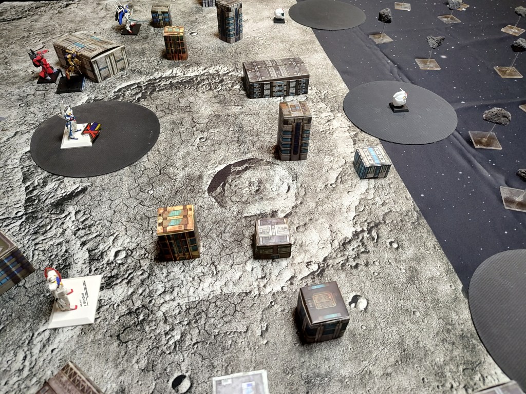 In this post we have a MechaStellar Battle Report using the draft VER10 rules. We have a lunar battlefield with a good amount of terrain and some high end machines battling it out. In this cross-universe SRW style game, Haman Karn heard a rumor that the golden mobile suit was still fighting and she went to investigate thinking that Char was still alive. Instead her forces encountered the infamous White Doll