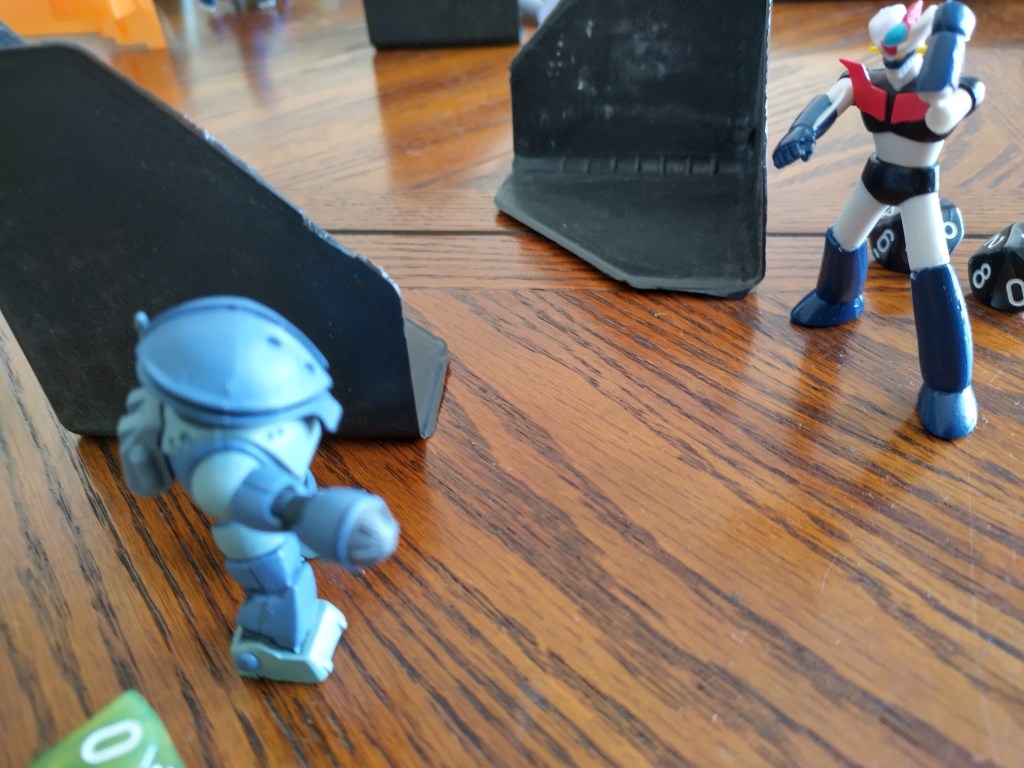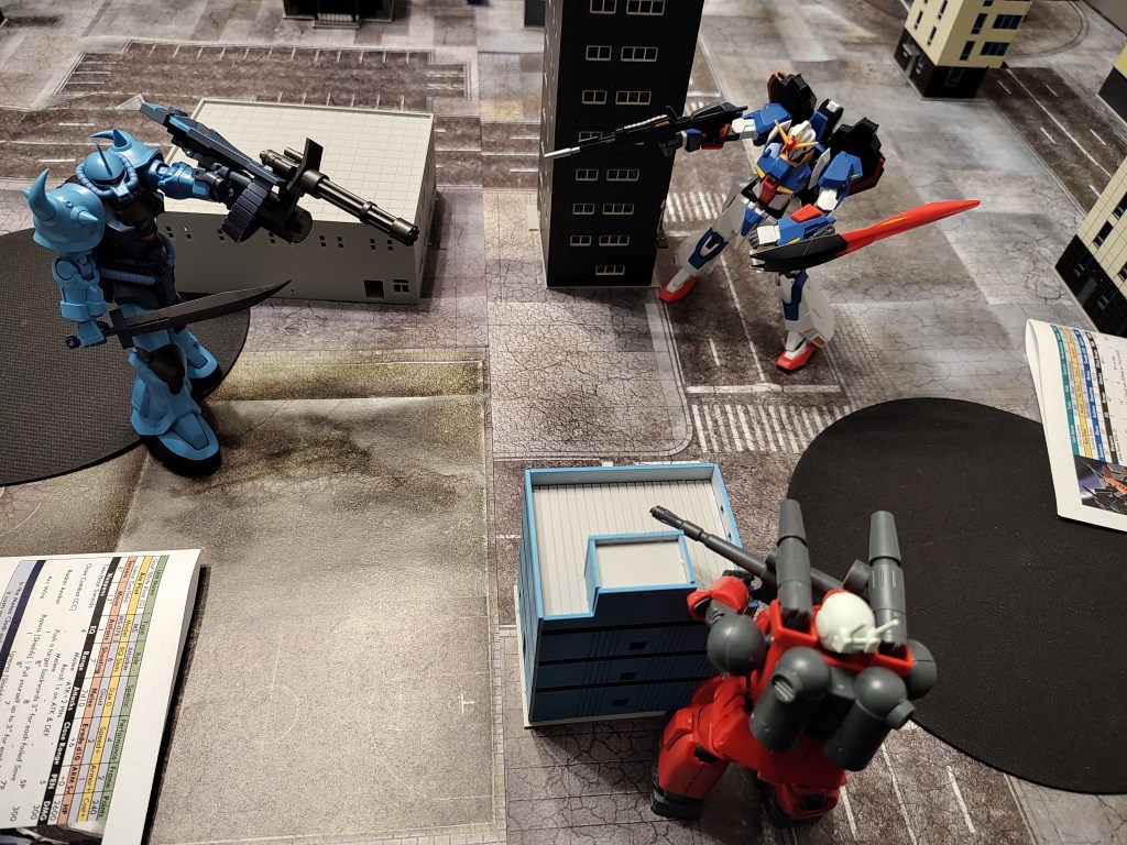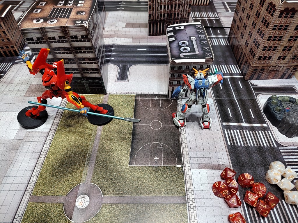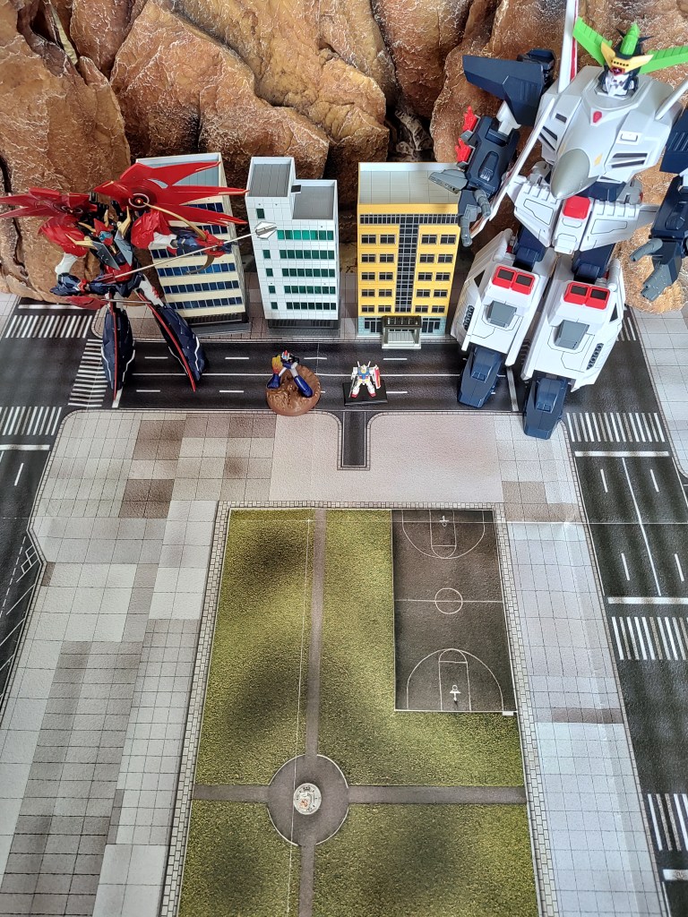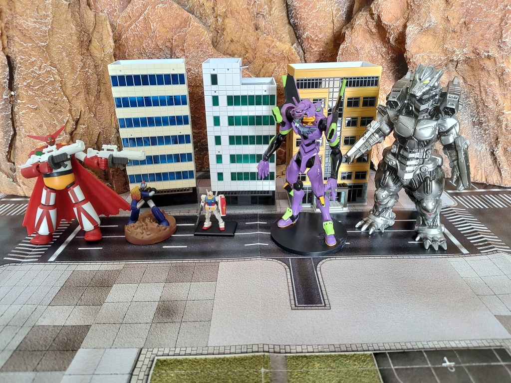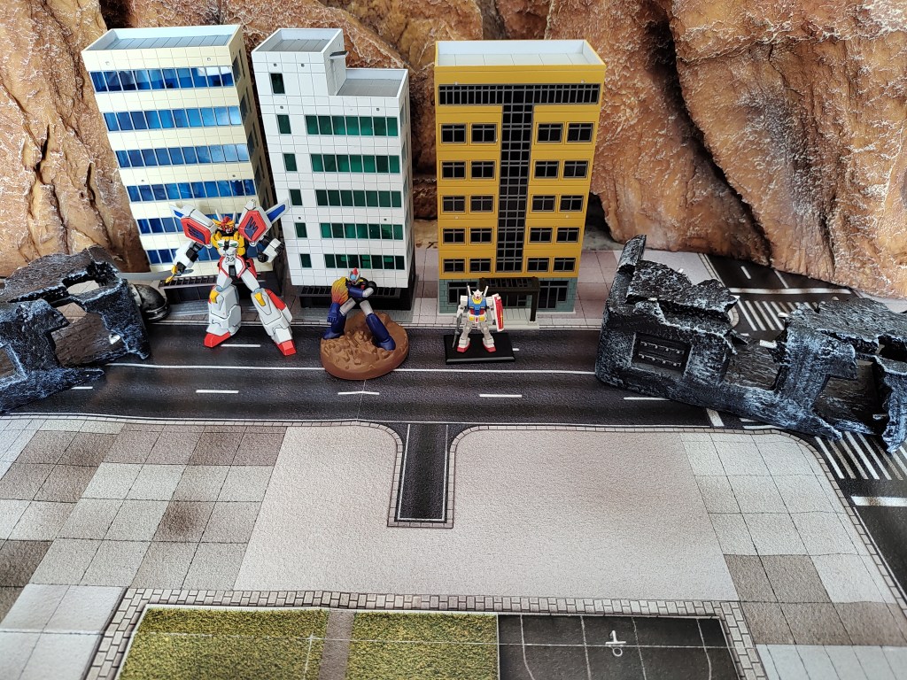 If you are playing with large models you may want to consider getting some large buildings. An affordable and transportable set can be found from the tabletop wargame Drop Zone Commander, specifically the cityscape set. Here’s an example of what it looks like with some MSIA Gundam figures (4.5″) and Revoltech Evangelion figures (6″)